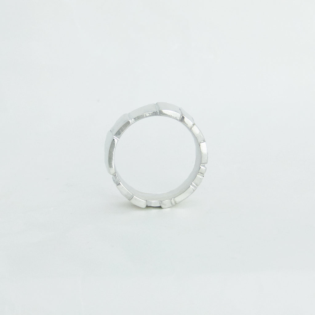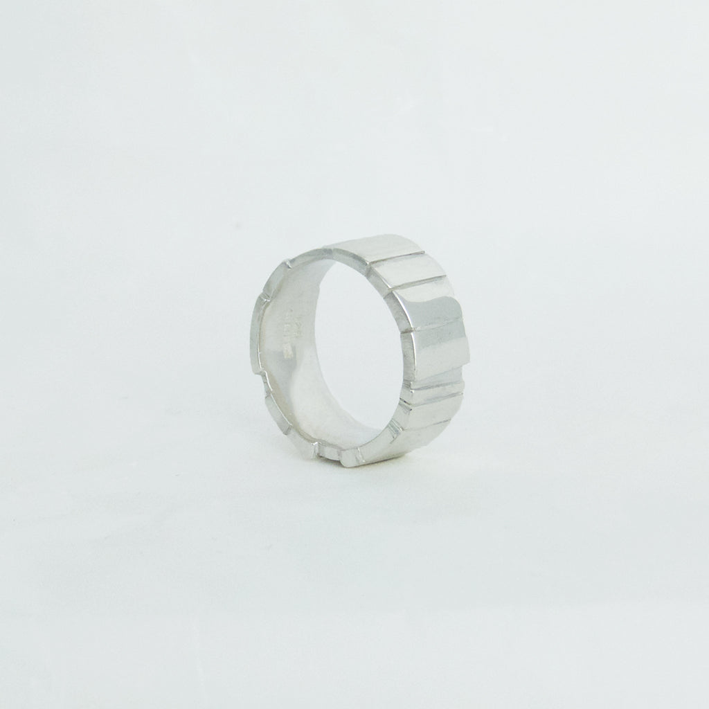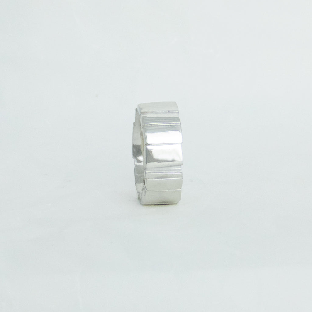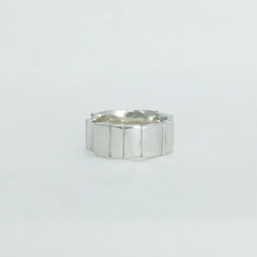 Ein schmaler Ring aus der Kollektion Flächen gefertigt aus 925/000 Silber. Die Flächen sind in ihrer Form und Position ungleichmäßig. Der Ring ist 8mm breit.