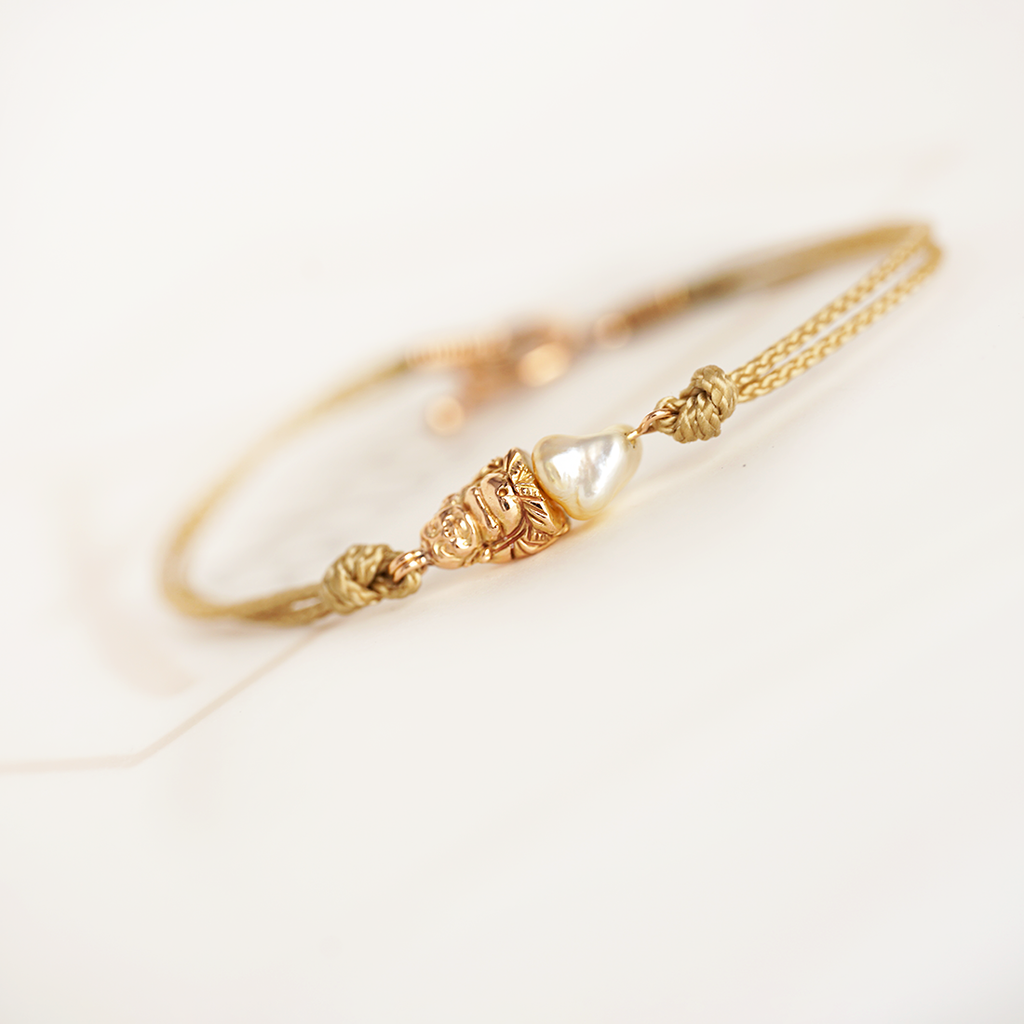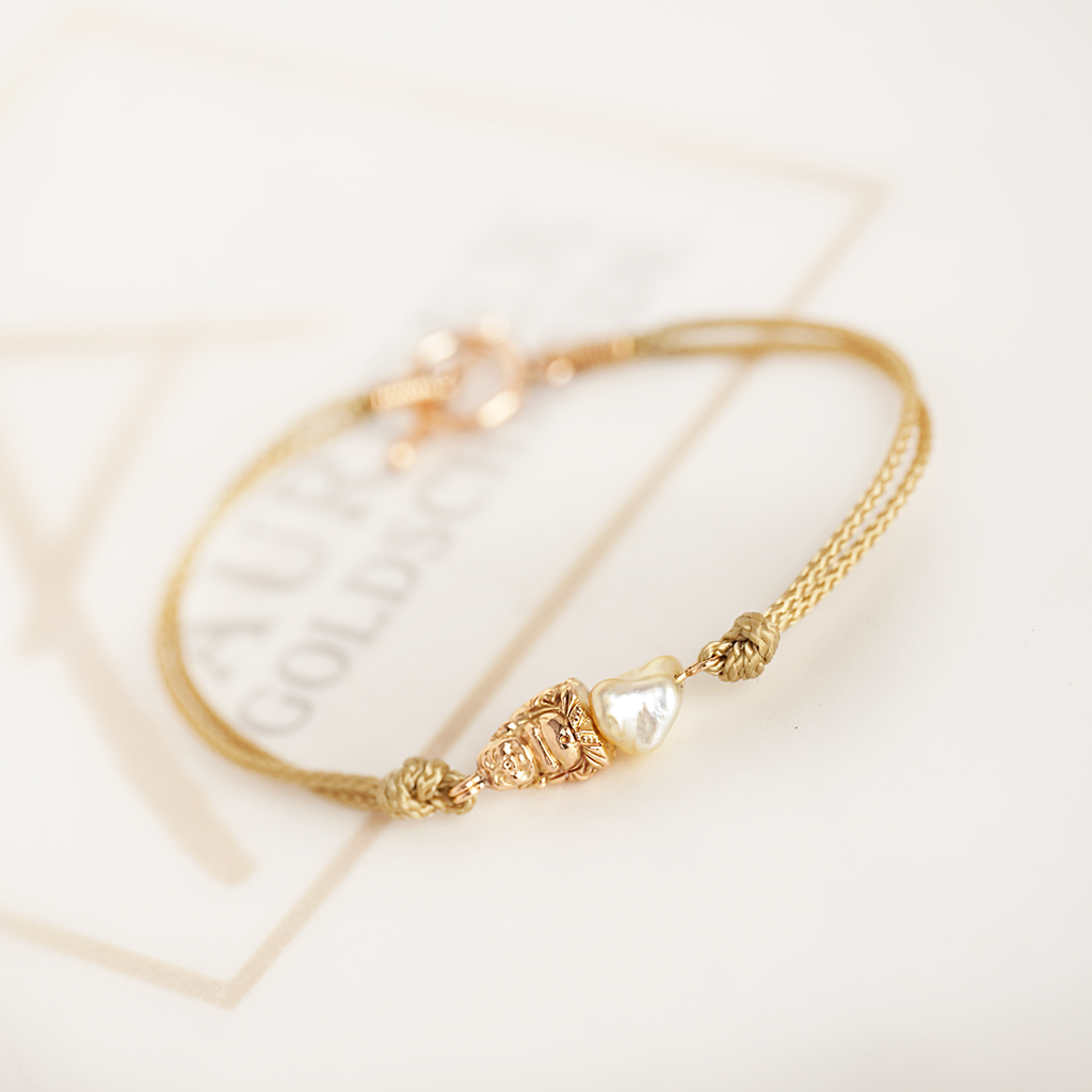 Ein zartes Armband gefertigt aus 750/000 Gelbgold mit Paracord. Hauptakteur dieses Armbands ist der Buddha mit einer polierten Oberfläche und die weiße Südsee-Keshi Perle. Zu verschließen ist das Armband mit einem Knebelverschluss aus 750/000 Gelbgold.
