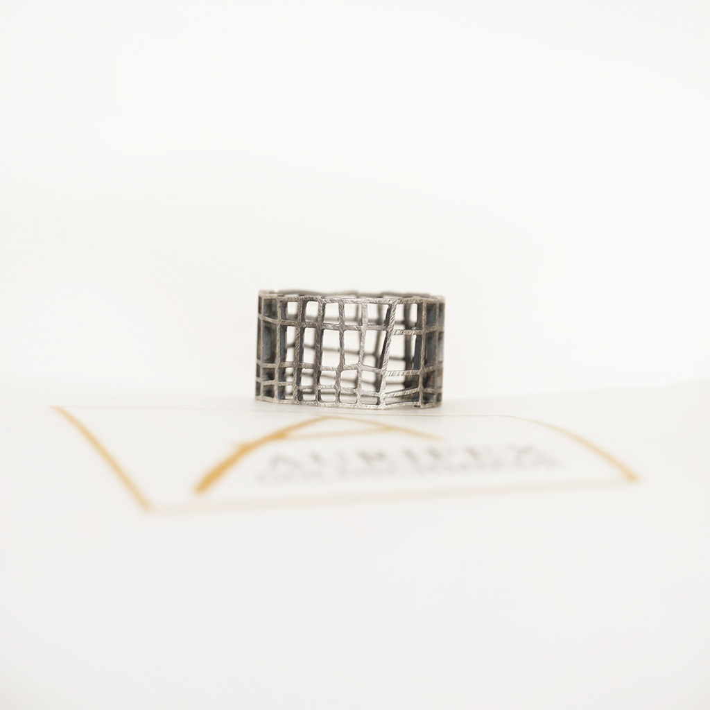 Ein leichter, breiter Ring aus der Kollektion Carré gefertigt aus 925/000 Silber geschwärzt mit einer mattierten Oberfläche. Dieses Modell eignet sich zum Stecken und Kombinieren mit dem mittelbreiten und schmalen Modell.