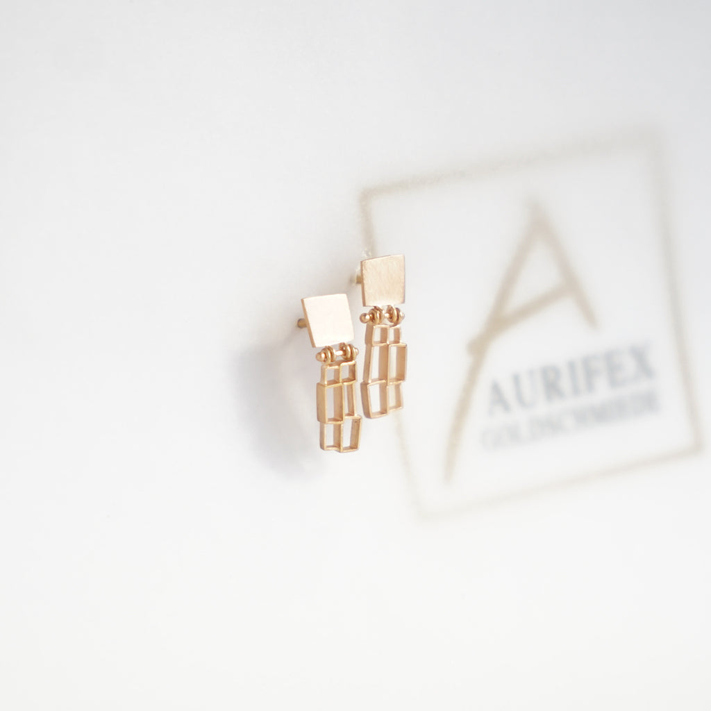 Ein luftig-leichter Ohrschmuck aus der Kollektion Carré gefertigt aus 750/000 Rotgold mit einer mattierten Oberfläche. Der Ohrstecker besteht aus einer Fläche und einem beweglich aufgehängten Carré Element.