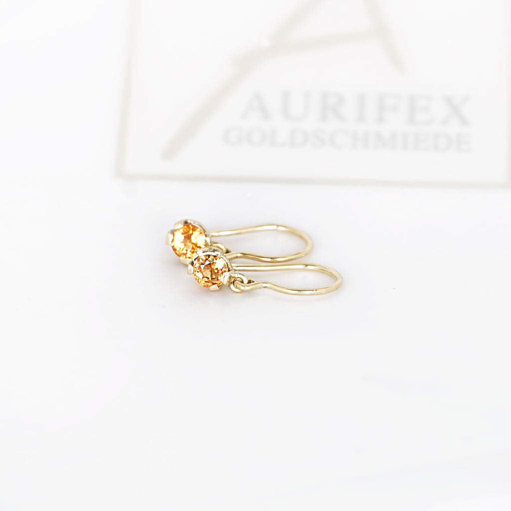 Ein farbintensiver Ohrschmuck gefertigt aus 750/000 Gelbgold mit einer mattierten Oberfläche. Im Mittelpunkt dieses Schmuckstücks stehen die beiden Mandarin Granat im Farbton Fanta mit ingesamt 0,50ct.