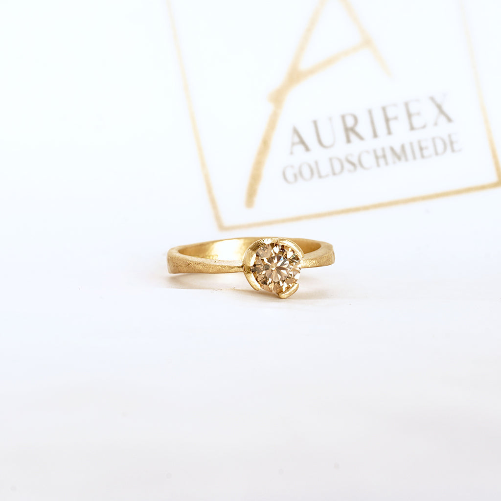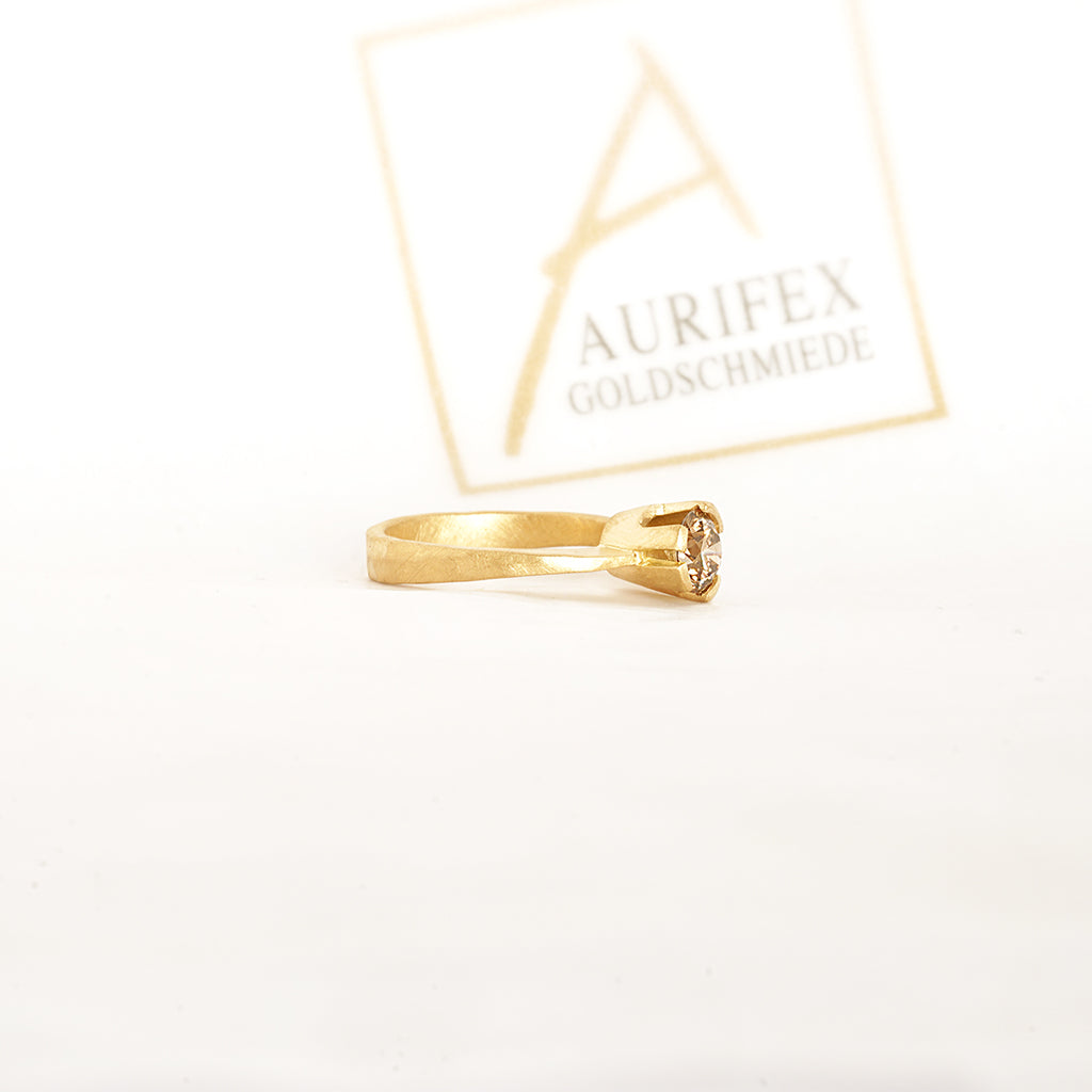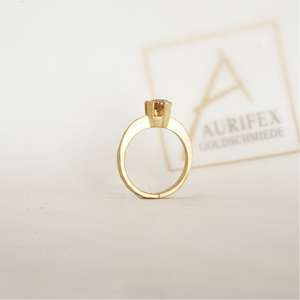 Ein außergewöhnlicher Solitair Ring aus der Kollektion Facettenreich gefertigt in 750/000 Gelbgold mit einer mattierten Oberfläche. Im Mittelpunkt steht hier ein Brillant mit insgesamt 1,00ct im Farbton C4. Die matte Oberfläche des Gelbgolds lässt den funkelnden Brillant in seiner vollen Pracht strahlen.