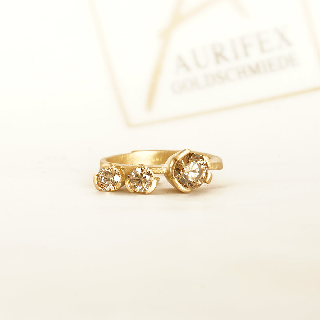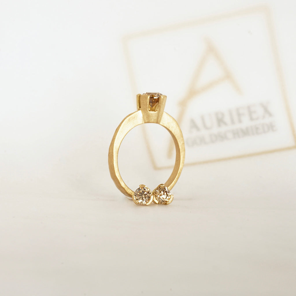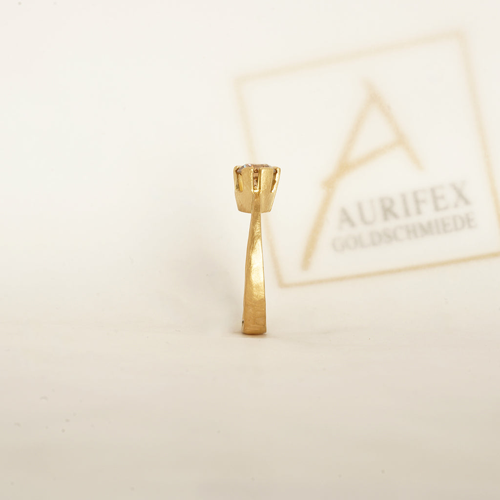 Ein außergewöhnlicher Solitair Ring aus der Kollektion Facettenreich gefertigt in 750/000 Gelbgold mit einer mattierten Oberfläche. Im Mittelpunkt steht hier ein Brillant mit insgesamt 1,00ct im Farbton C4. Die matte Oberfläche des Gelbgolds lässt den funkelnden Brillant in seiner vollen Pracht strahlen.