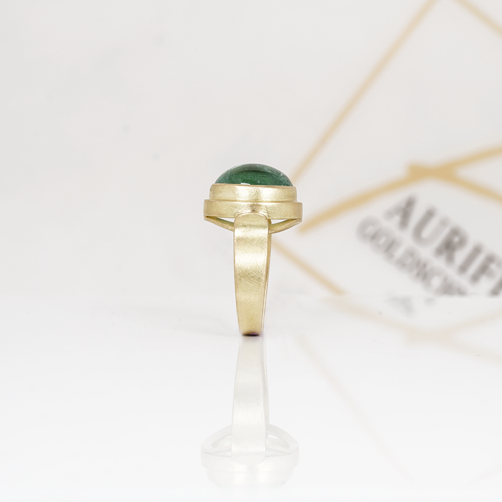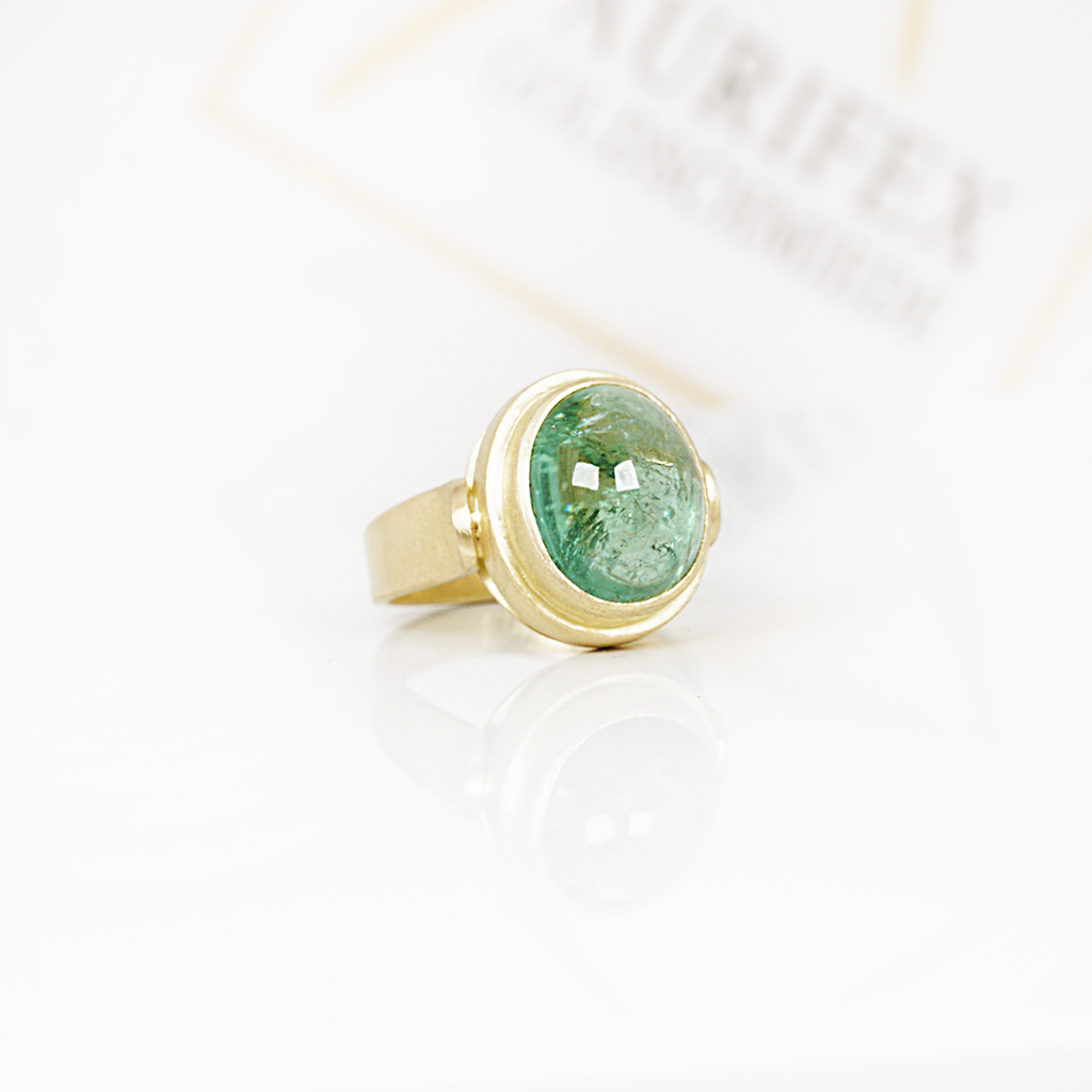 Ein besonderer Ring aus der Kollektion Unikat in 750/000 Gelbgold mit einer mattierten Oberfläche. Hauptakteur dieses Rings ist der grüne Turmalin mit 10,99ct, der in einer besonderen Fassung gekonnt in Szene gesetzt ist. Durch die Ausschnitte an der Seite der Fassung erhält der Edelstein auch von unten Licht und leuchtet dadurch noch intensiver.