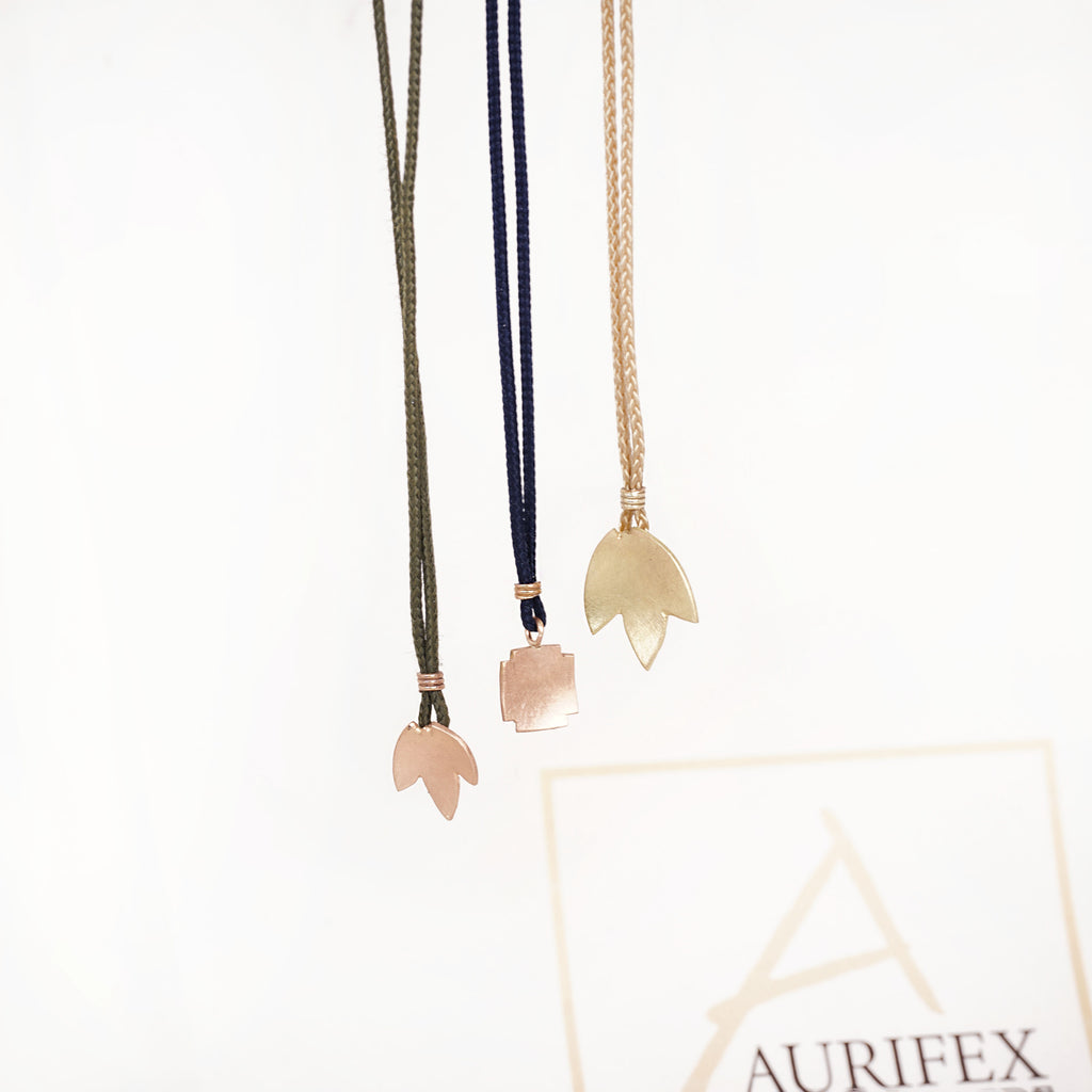 Ein leichter Halsschmuck aus der Kollektion Feine Form in 750/000 Gelbgold mit einer mattierten Oberfläche. Der Anhänger mit dem großen Dreifach ist an einem Band aus Paracord befestigt und kann durch die Schiebehülse in der Länge variiert werden.