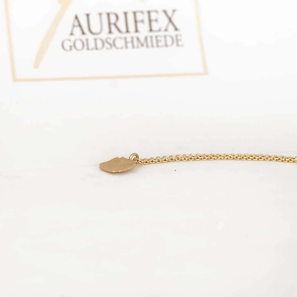 Ein zarter Halsschmuck aus der Kollektion Feine Form mit dem Kreuz in 750/000 Gelbgold mit einer mattierten Oberfläche. Das Kreuz ist an einer feinen Ankerkette mit 46cm befestigt.