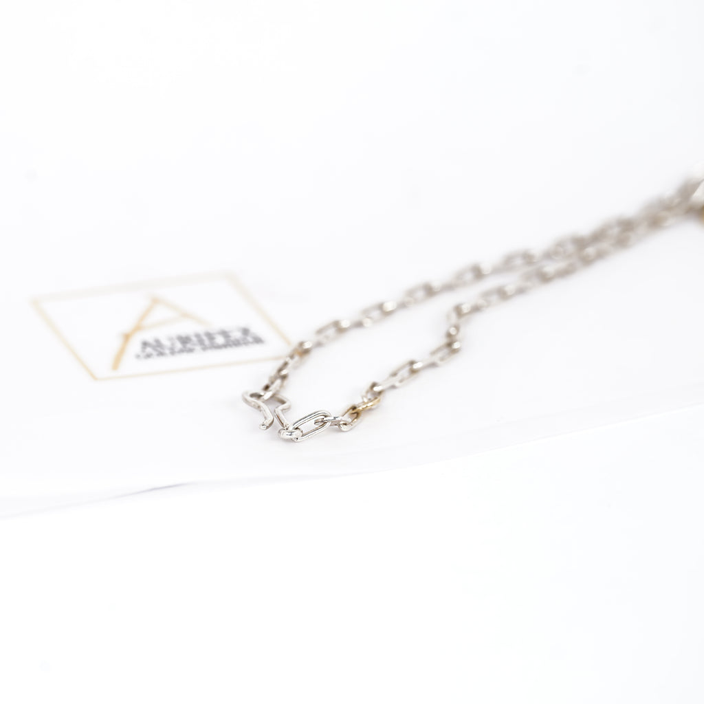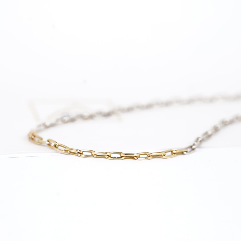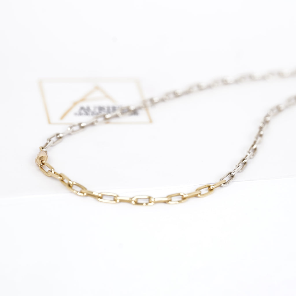 Ein besonderer Halsschmuck aus der Kollektion Feine Form gefertigt in 925/000 Silber und 750/000 Gelbgold mit einer polierten Oberfläche. Der Halsschmuck besteht aus kräftigen Schmalösen die sich weich fließend an den Körper anschmiegen. Ergänzt wird die Ösenkette durch einen Zipfel in 750/000 Gelbgold. Als  Verschluss wurde ein passender S-Haken angebracht. Diese Kette eignet sich hervorragend dazu Anhänger anzubringen. Die Kette ist 59cm lang.