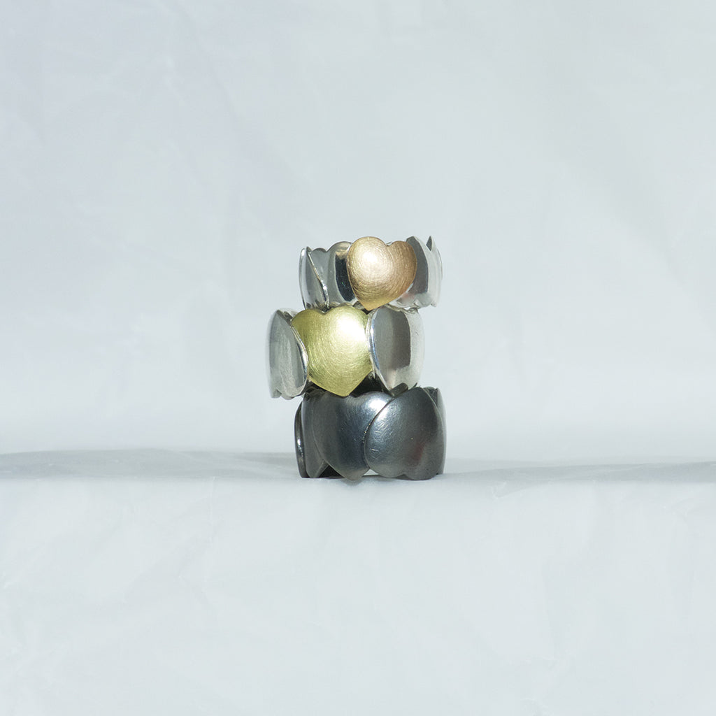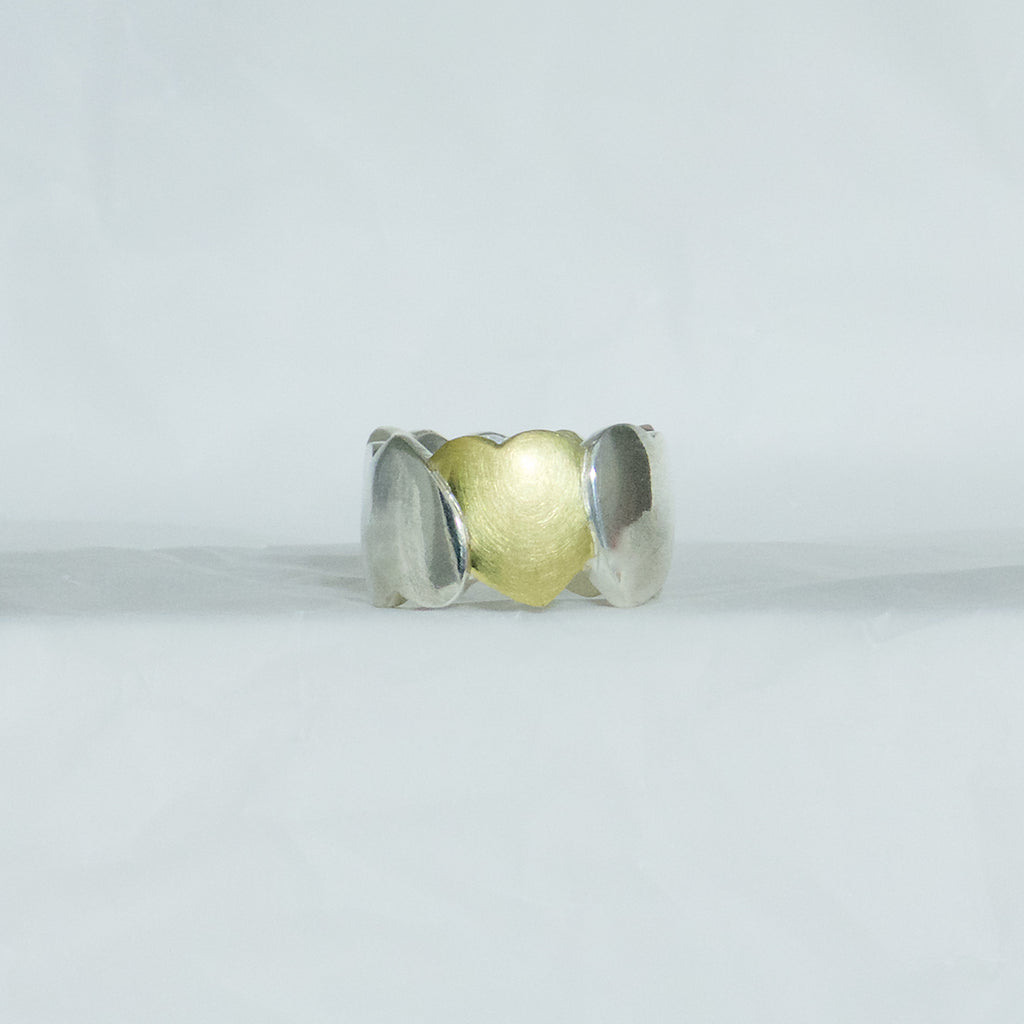 Ein breiter, polierter Ring aus unserer Kollektion Herzen gefertigt aus Silber 925/000. Ein Herz auf diesem Ring wurde als Blickfang mit Gelbgold 750/000 belötet. Um den Kontrast zu unterstützen wurde das Herz aus Gelbgold mattiert. Der Ring ist 15mm breit.