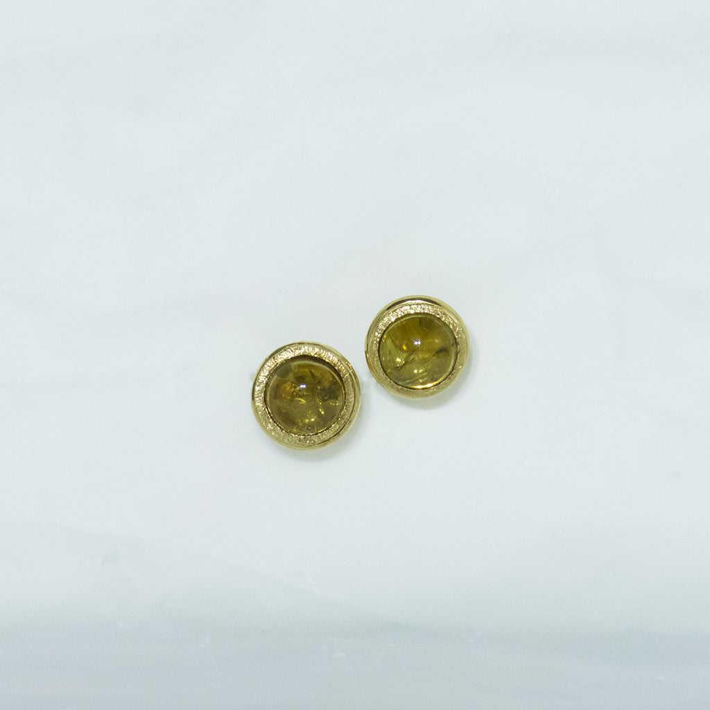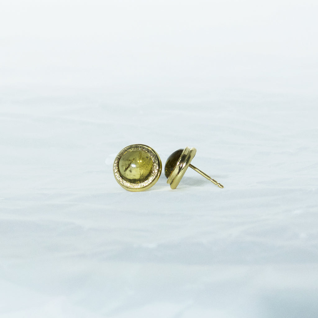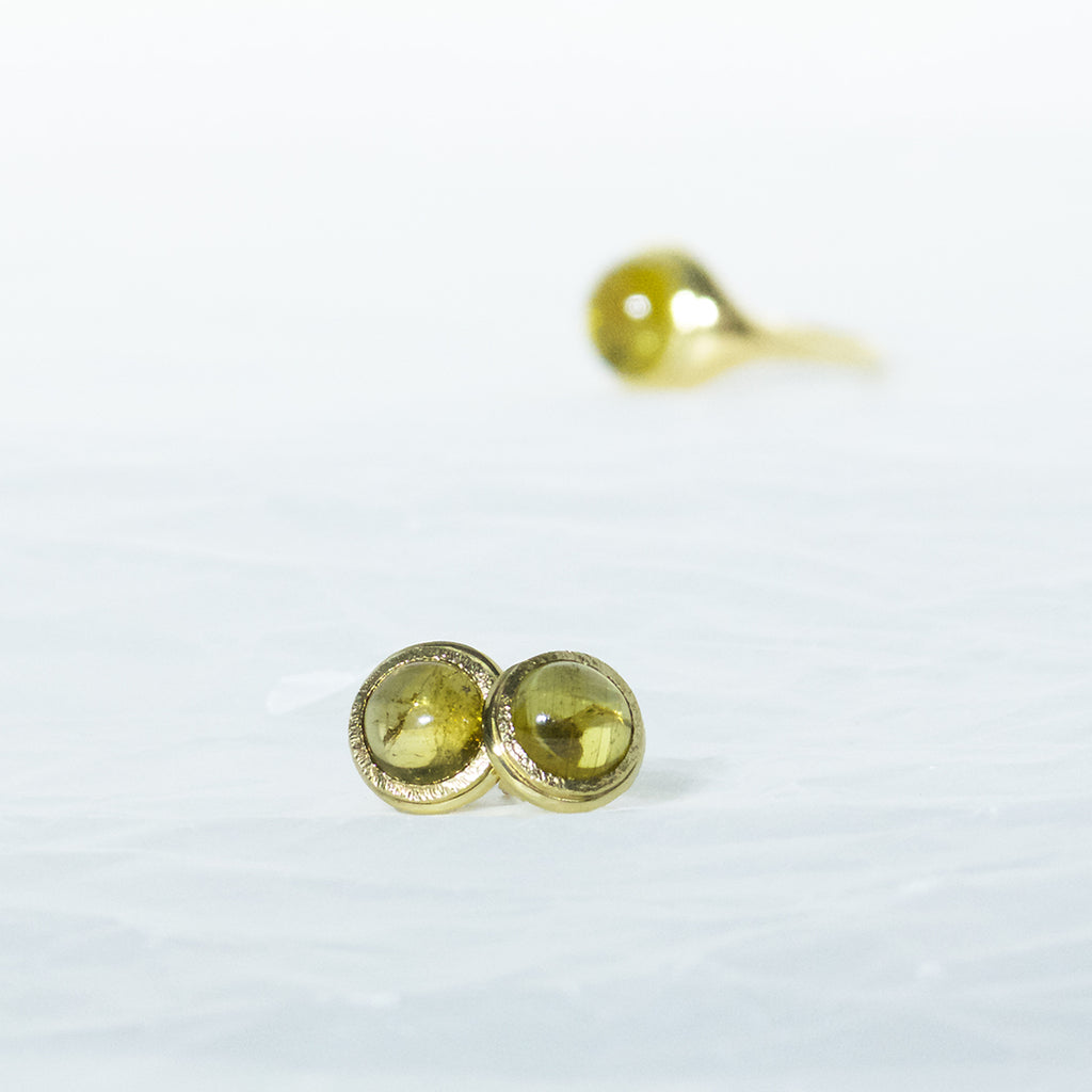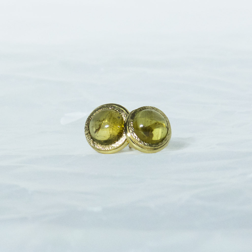 Ein farbintensives Ohrstecker Set aus unserer Unikat Kollektion handgefertigt in 750/000 Gelbgold. Im Mittelpunkt dieses Ohrschmucks stehen zwei hellgrüne Turmaline im Cabochon Schliff mit insgesamt 6,58ct, die durch das Gelbgold in ihrer Farbe bekräftigt werden. Die Ohrstecker haben einen Durchmesser von 12mm.