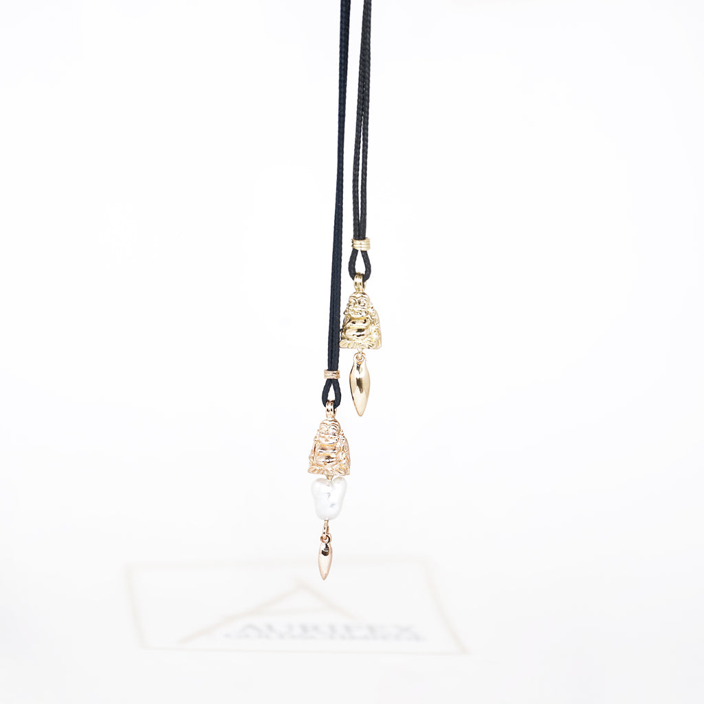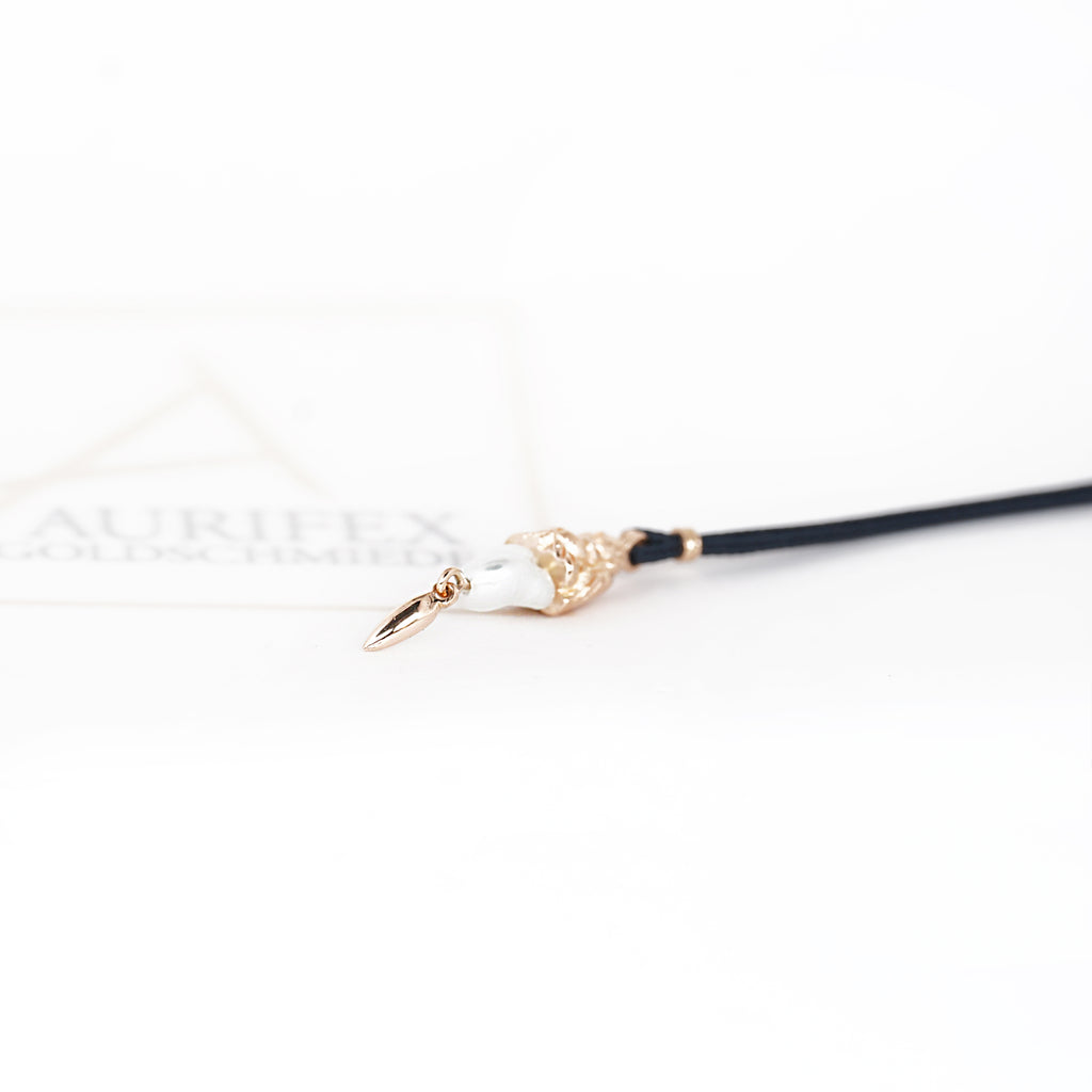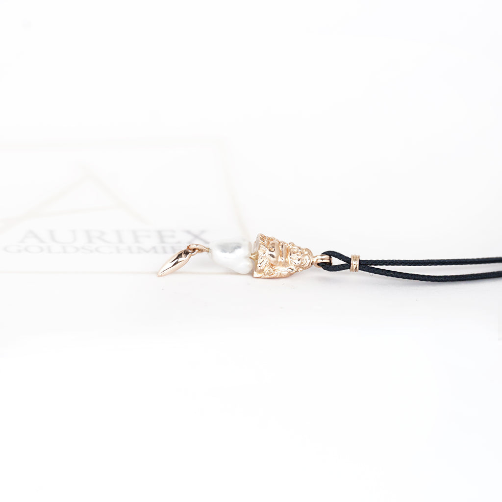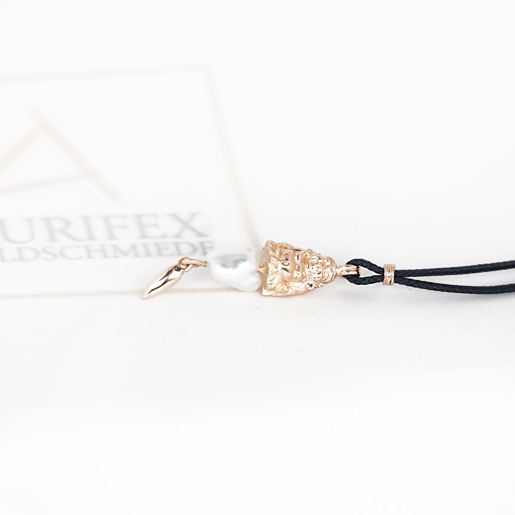Ein zarter Halsschmuck gefertigt aus 750/000 Rotgold mit Paracord. Hauptakteur dieses Halsschmucks ist der Buddha mit einer polierten Oberfläche und die weiße Keshi Perle.
