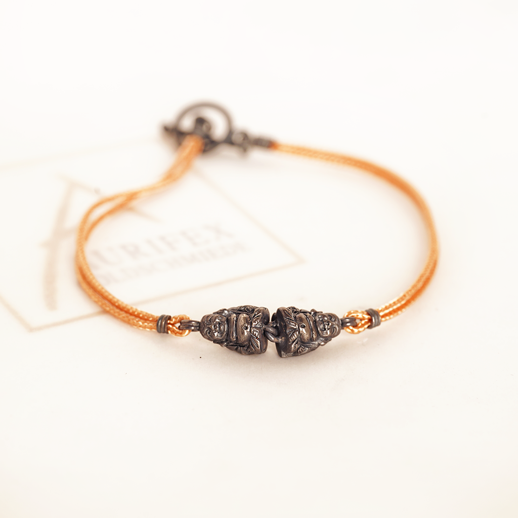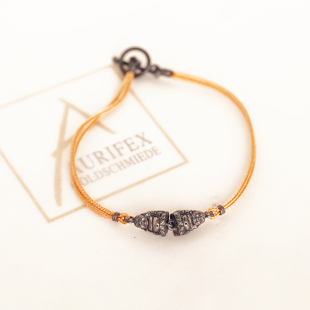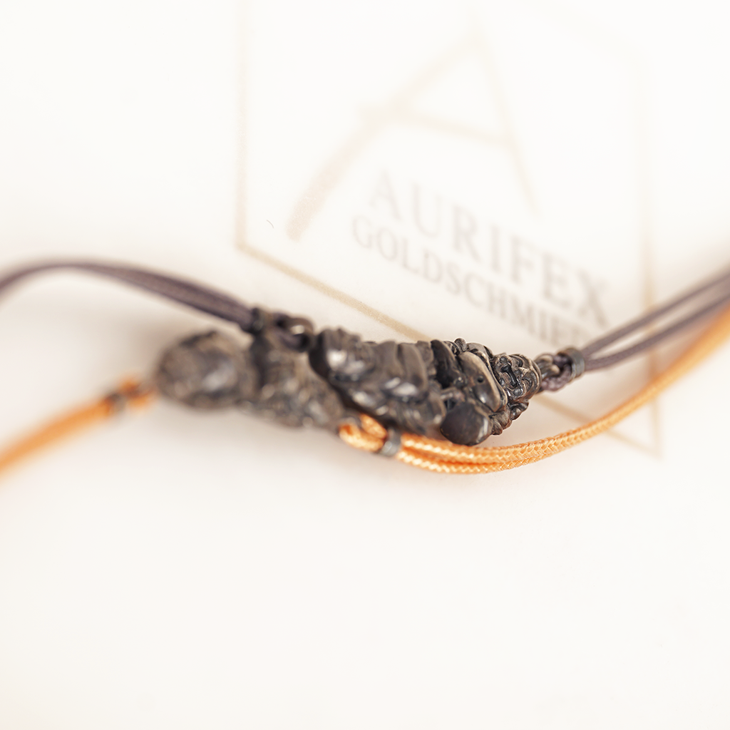 Ein zartes Armband gefertigt aus 925/000 Silber geschwärzt mit Paracord. Hauptakteur dieses Armbands sind die beiden, kleinen Buddhas mit einer polierten, geschwärzten Oberfläche. Zu verschließen ist das Armband mit einem Knebelverschluss aus 925/000 Silber geschwärzt.