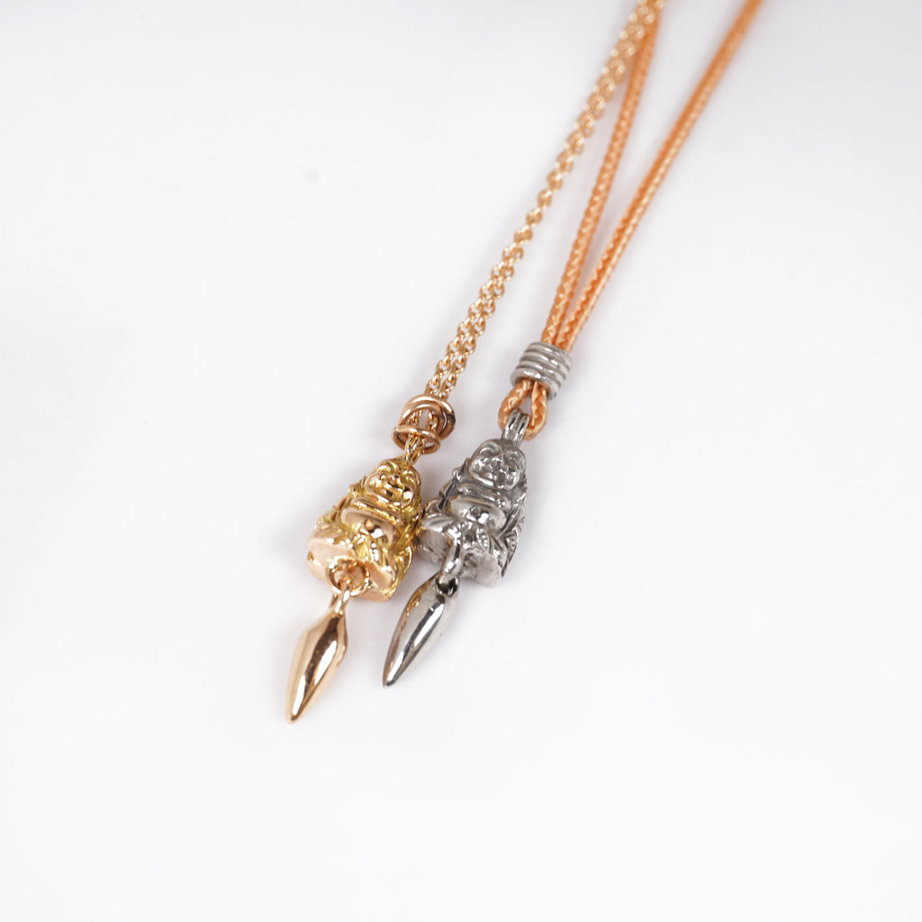 Ein zarter Halsschmuck gefertigt aus 950/000 Platin mit Paracord. Hauptakteur dieses Halsschmucks ist der Buddha mit einer polierten Oberfläche, der ergänzt wird mit einem feinen Zipfel. Das Anhänger ist an einem Band aus Paracord gefertigt.
