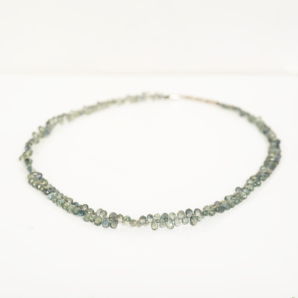 Ein farbintensiver Halsschmuck aus unserer Kollektion Unikat. Die Halskette besteht aus feinen, Saphiren im Briolett-Schliff mit insgesamt 89,82ct. Zu verschließen ist die Halskette mit einem S-Haken, gefertigt aus 950/000 Platin mit einer polierten Oberfläche.