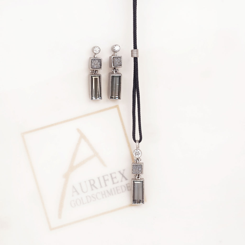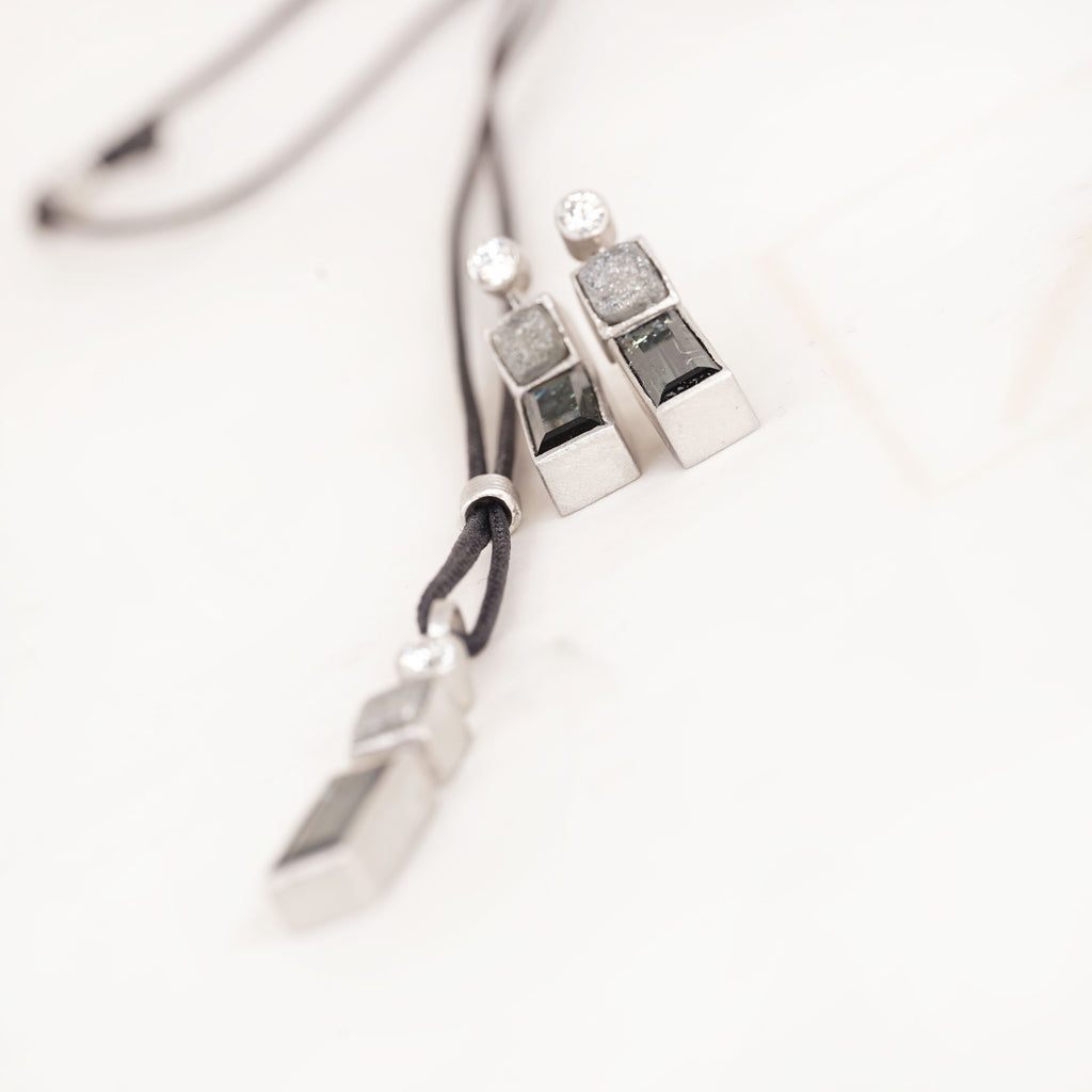 Ein außergewöhnlicher Ohrschmuck aus der Kollektion Unikat in 950/000 Platin mit einer mattierten Oberfläche. Hauptakteure dieses Ohrschmucks sind die beiden grauen Turmaline mit insgesamt 6,27ct und die beiden Rohdiamanten mit insgesamt 1,15ct, die gekonnt in ergänzt werden durch zwei funkelnde Brillanten mit 0,185ct tw-si. Ein Ohrschmuck in kühlen Farben.