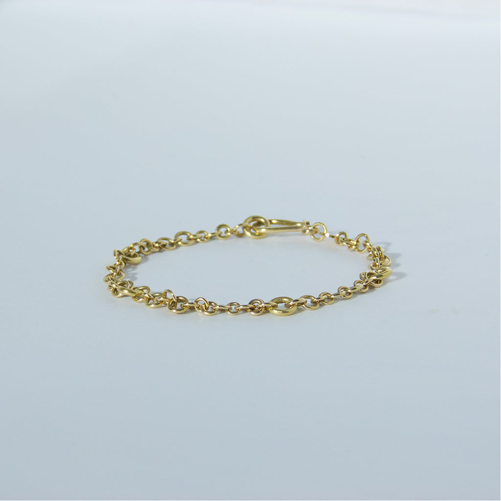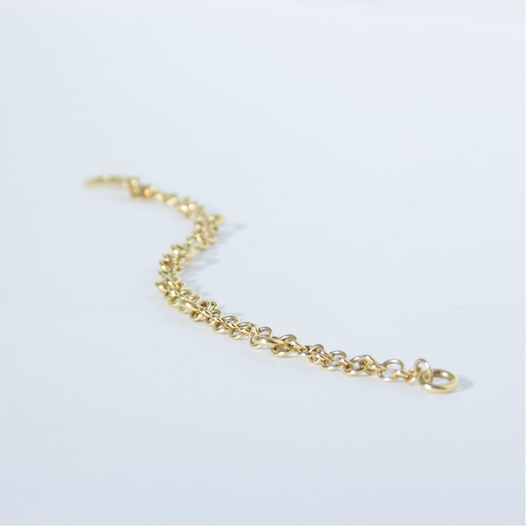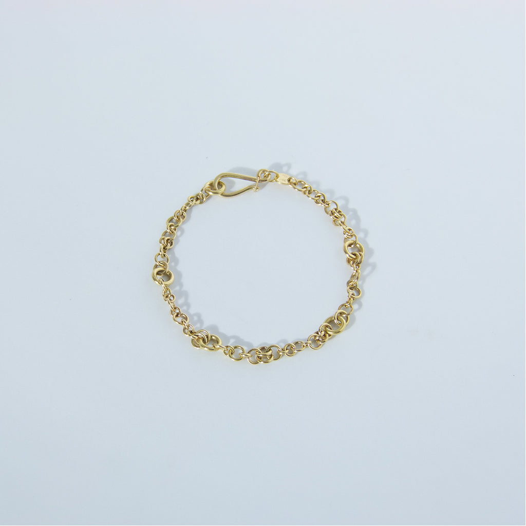 A delicate bracelet made of eyelets handmade in 750/000 red gold with a polished surface. The bracelet consists of various large and strong eyelets that create a varied picture. The bracelet is fastened with an S-hook, which guarantees a secure hold with an additional safety catch. The eyelet size for this bracelet is size M. Our eyelet bracelets and necklaces are available in sizes S,M and L. The bracelet is 20cm long.