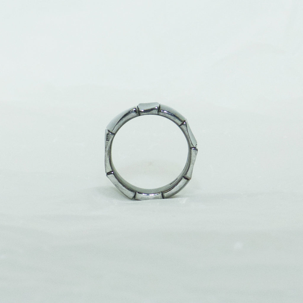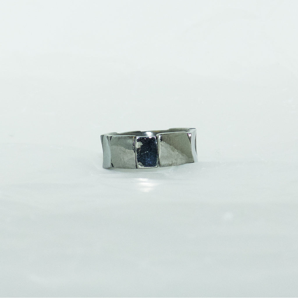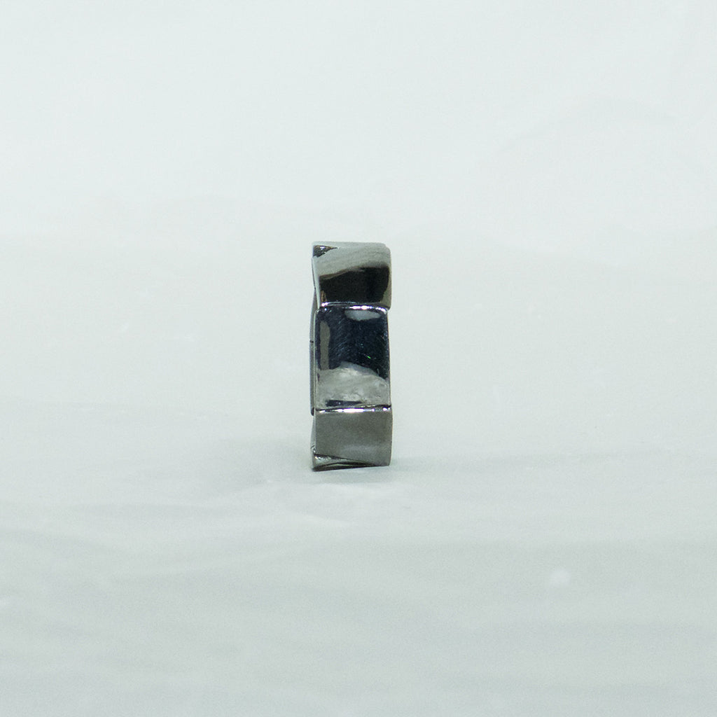 A polished, narrow ring from the Flächen collection made of blackened 925/000 silver. The convex and concave surfaces are uneven in shape and position, creating a varied look. The ring is 8mm wide