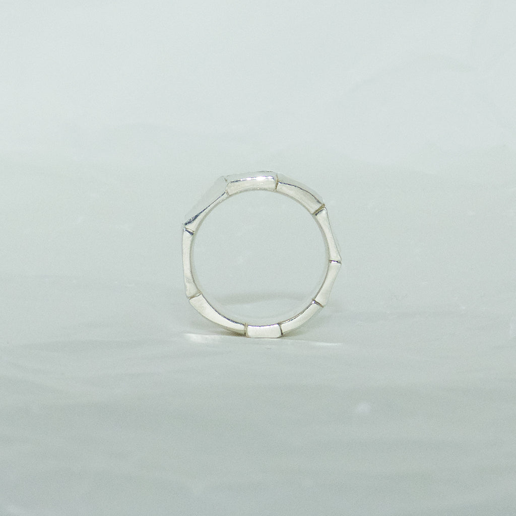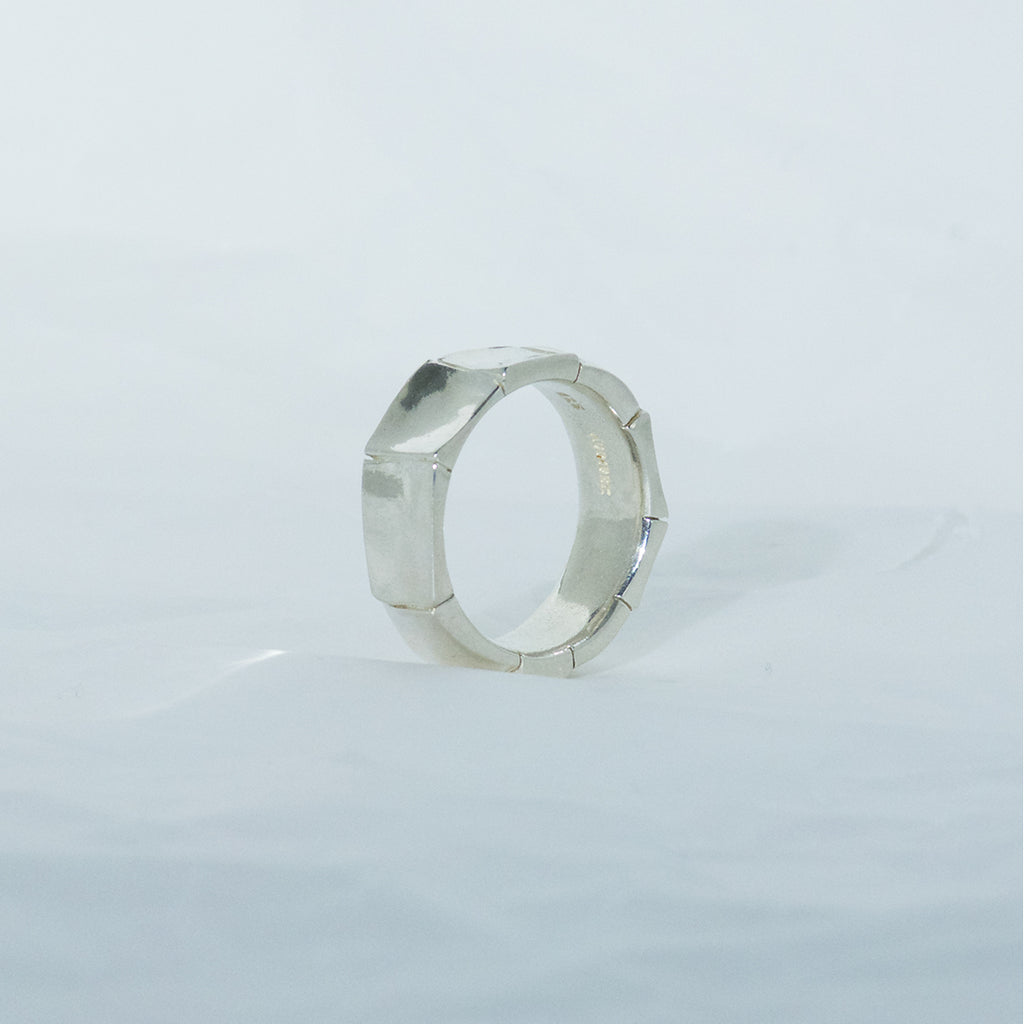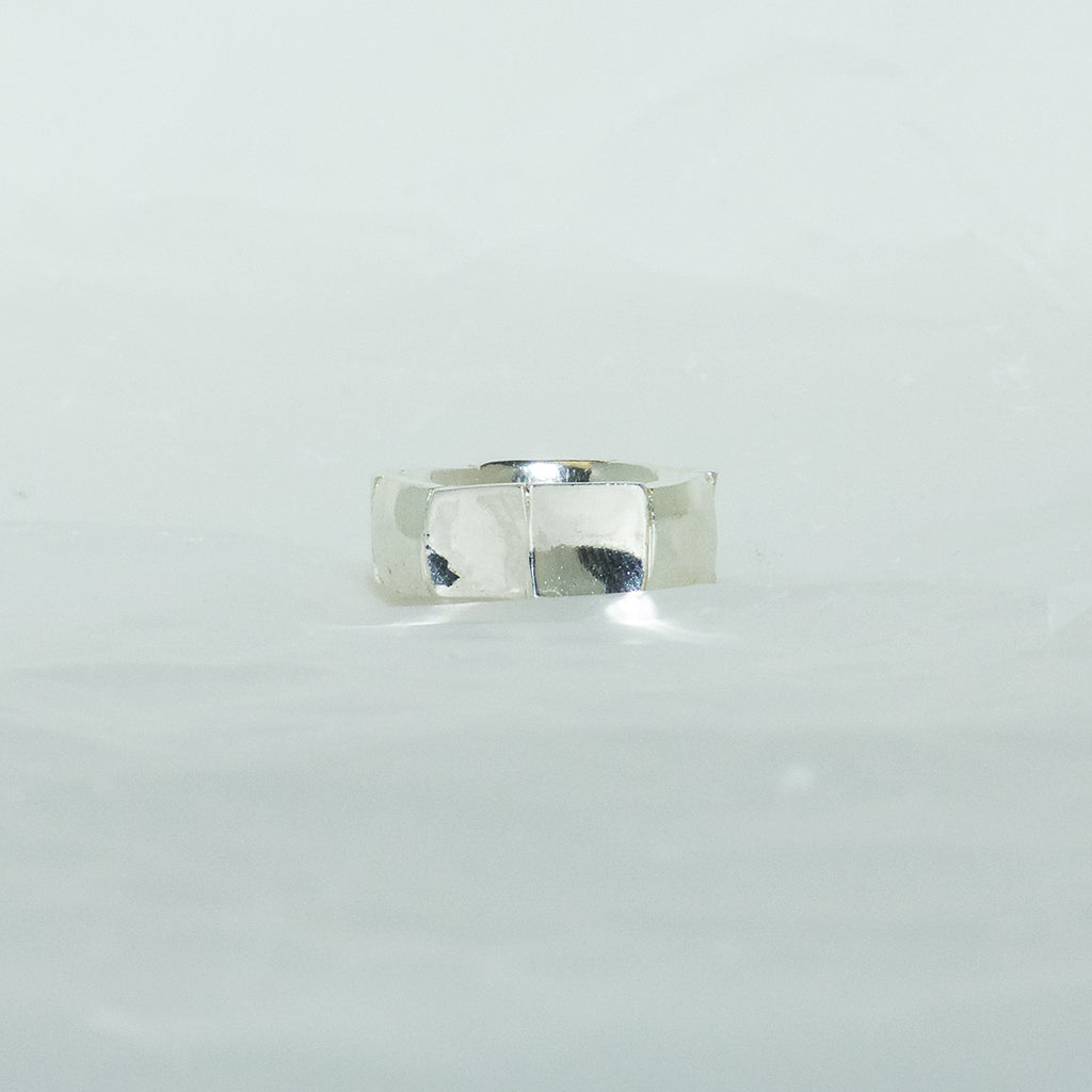 A polished, narrow ring from the Flächen collection made of 925/000 silver. The convex and concave areas are uneven in shape and position, creating a varied look. The ring is 8mm wide
