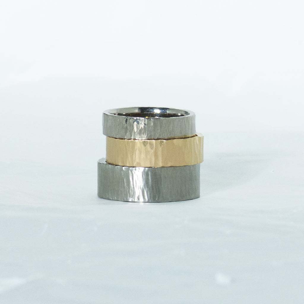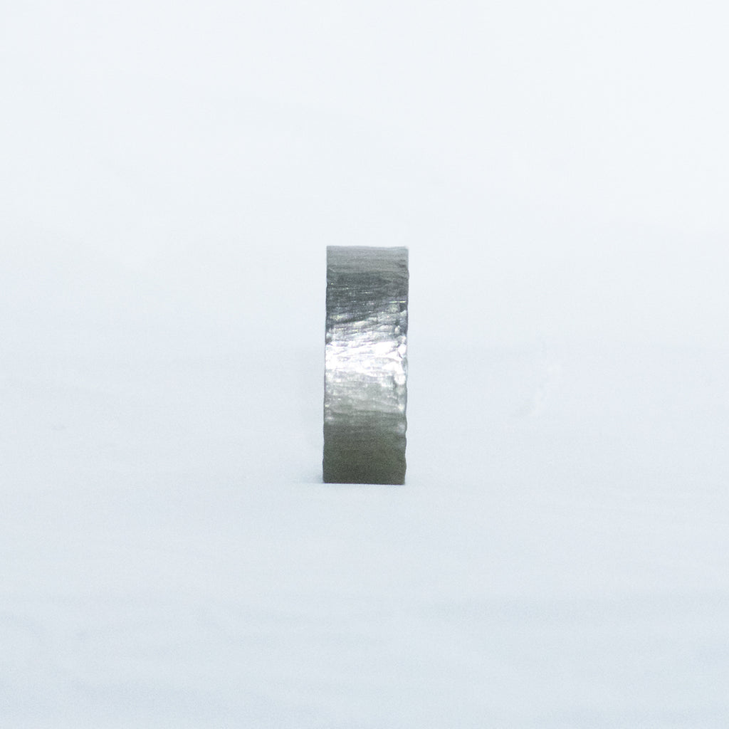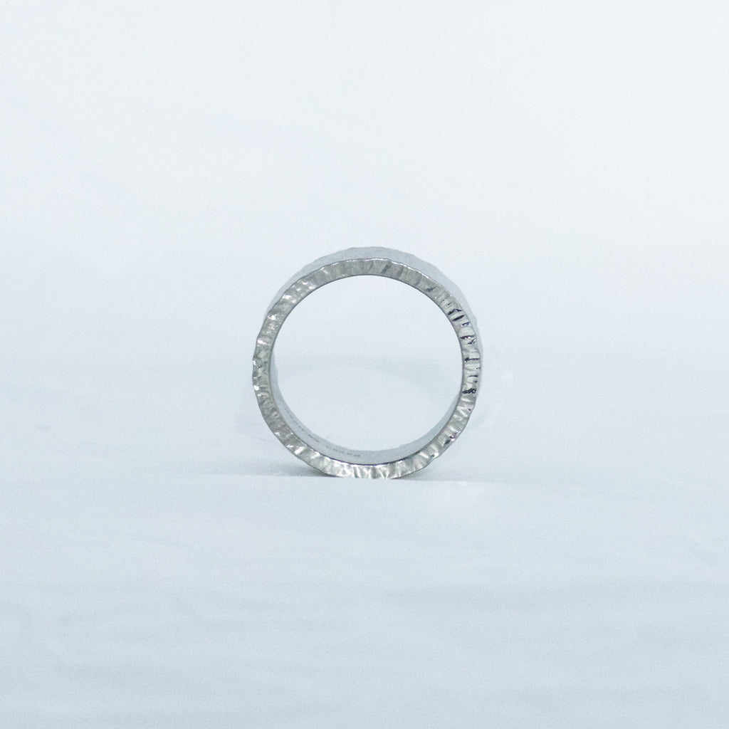 A broad, polished ring from our Partner Rings collection crafted in 750/000 white gold with a hammered finish. The irregular hammered surface creates a varied appearance. The ring is 8mm wide.