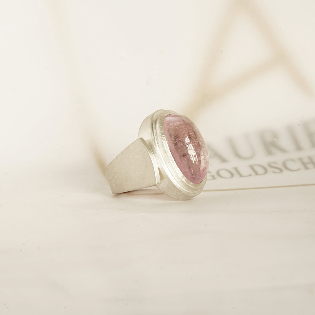 Ein auffälliger Ring gefertigt aus 925/000 Silber mit einer mattierten Oberfläche. Im Mittelpunkt dieses Schmuckstücks steht ein ovaler Kunzit mit 30,85ct.