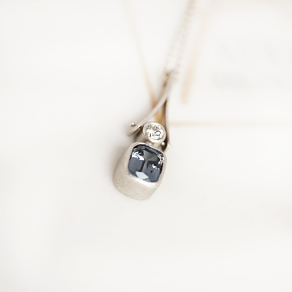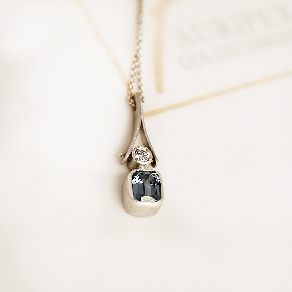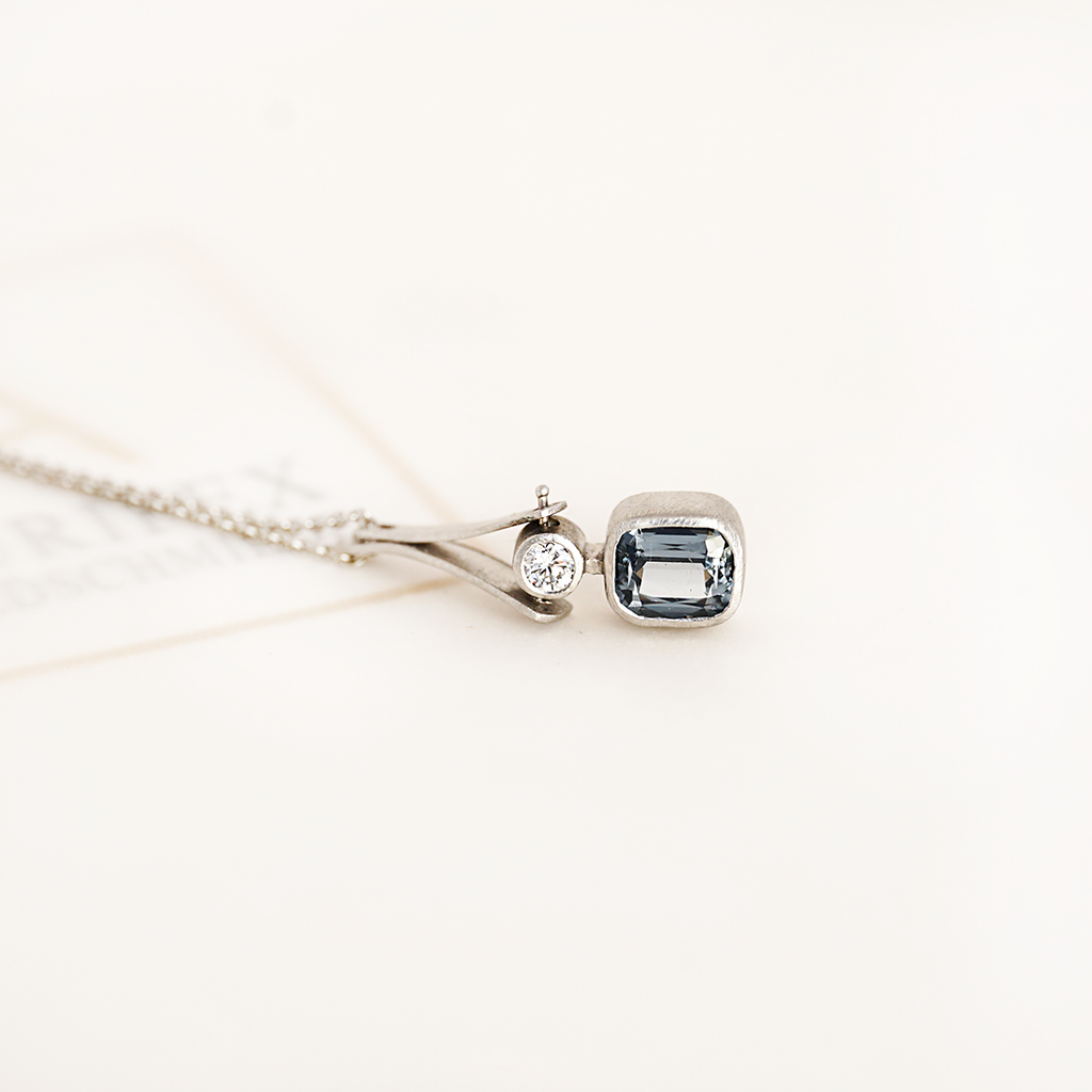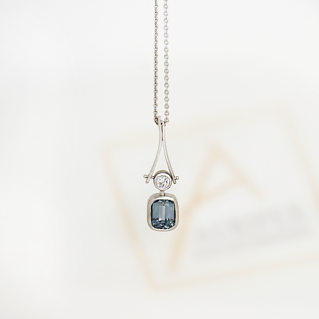 A delicate necklace from the Unikat collection in 950/000 platinum with a matt finish. The main protagonists of this necklace are the cool blue spinel with 1.62 ct and the brilliant-cut diamond with 0.15 ct tw-si. The pendant is attached to a delicate eyelet chain in 950/000 platinum with a length of 51 cm.