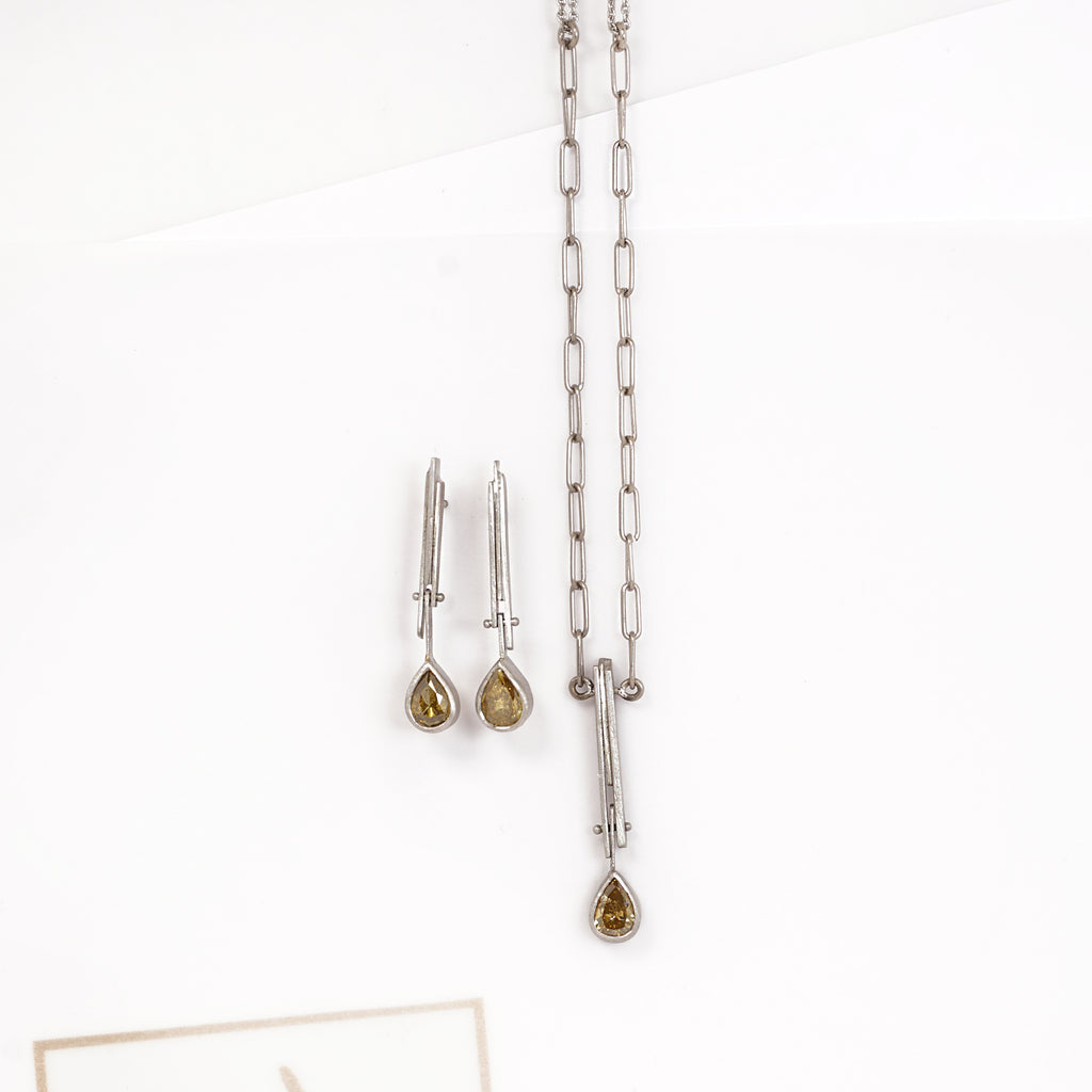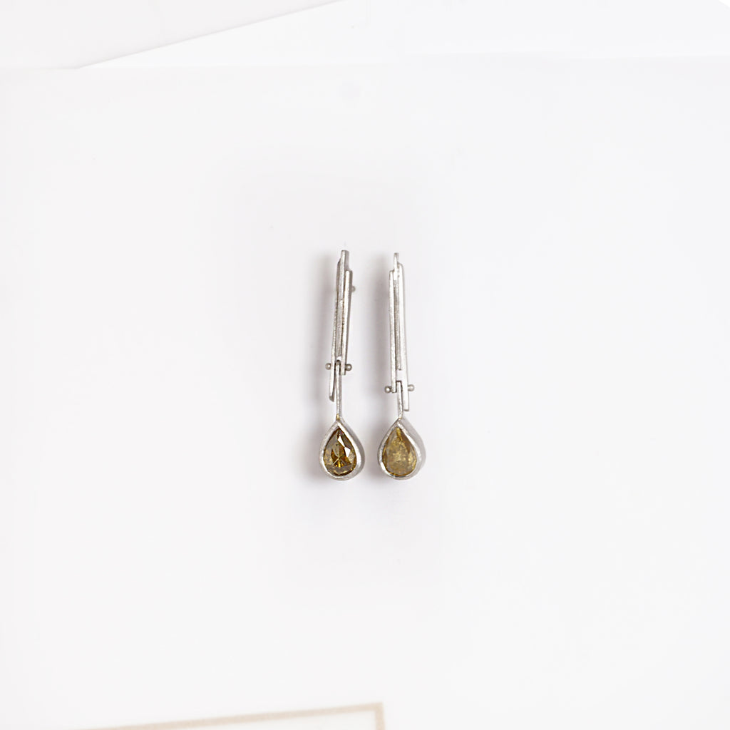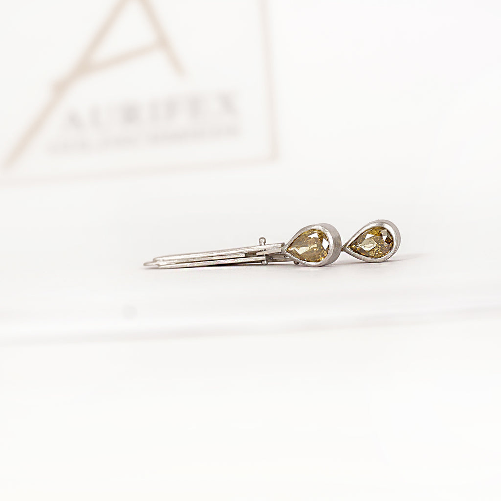 Ein besonderer Ohrschmuck aus der Kollektion Diamant gefertigt in 950/000 Platin mit zwei grünen Diamanttropfen mit insgesamt 1,09ct. Die Tropfen sind beweglich an dem oberen Teil des Ohrschmuck befestigt, sodass diese schon bei Bewegung schwingen.