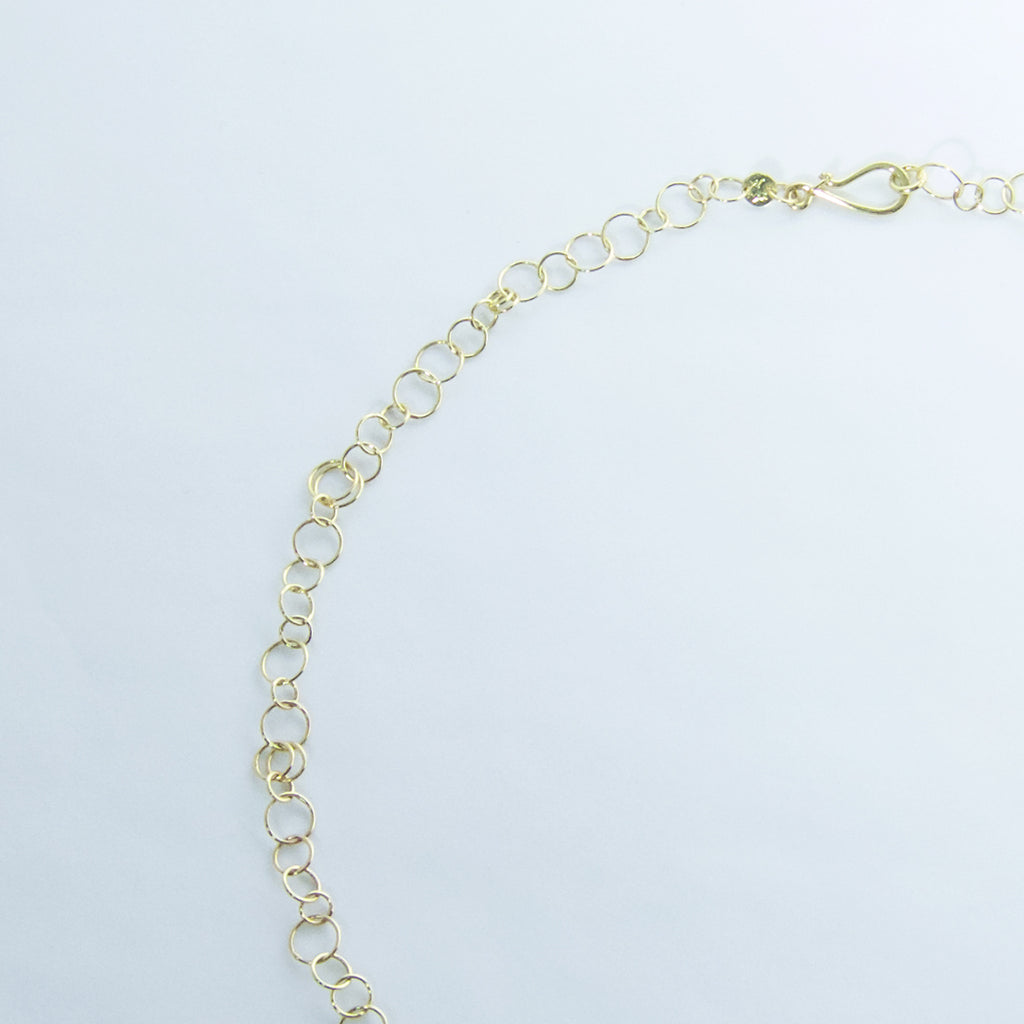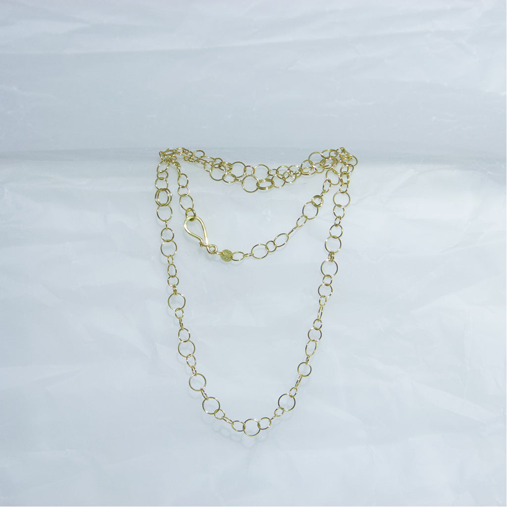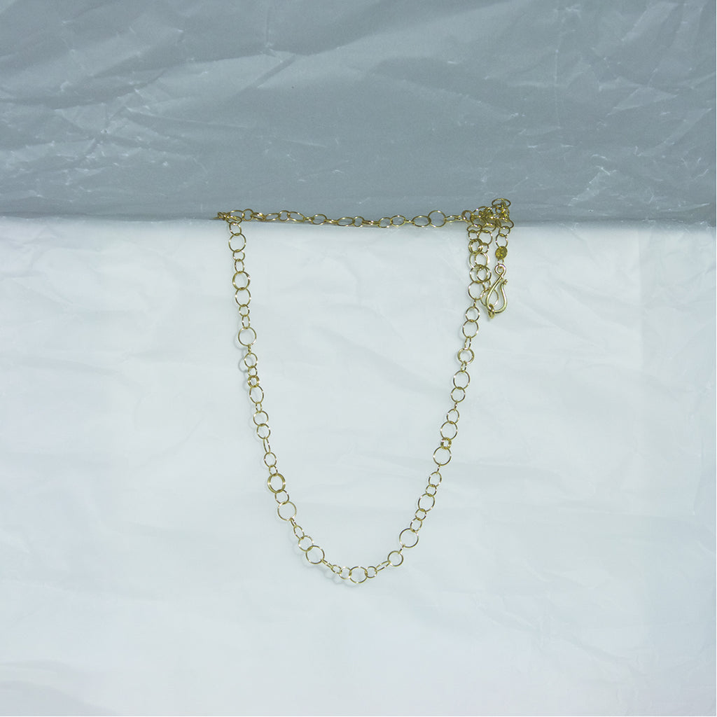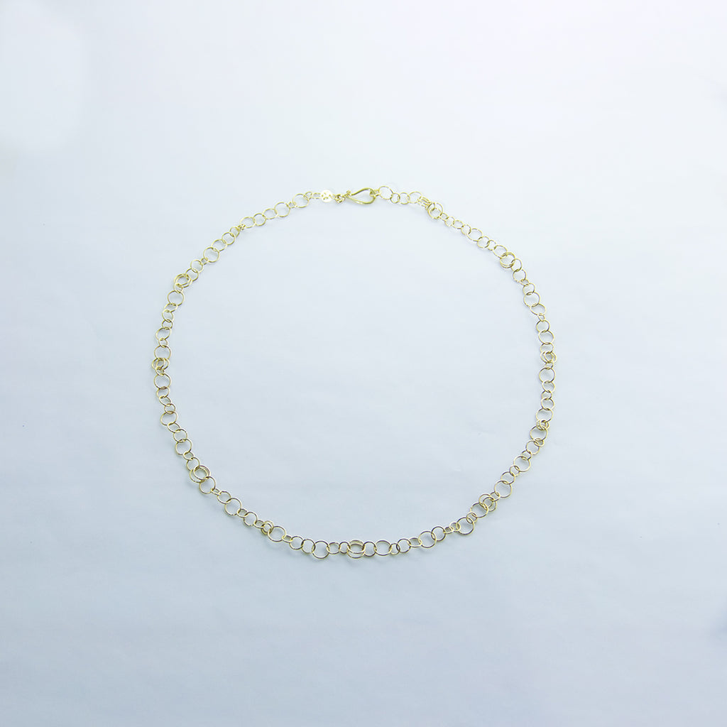 A delicate necklace from the Fine Form collection made in 750/000 yellow gold with a polished surface. The eyelet chain light model consists of eyelets in different sizes and thicknesses that nestle softly and flowingly against the body. A filigree S-hook has been attached as a clasp. The chain is 44cm long.