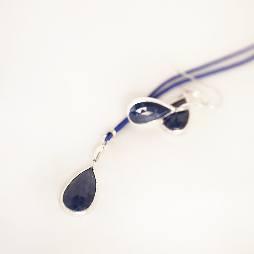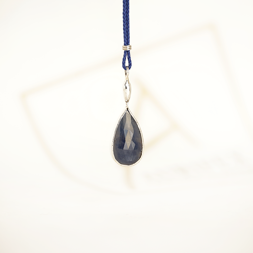 An unusual necklace from the Fine Shape collection made from 925/000 silver with a polished surface and paracord. The main protagonist of this necklace is the blue sapphire in a checker-cut with 13.69 ct.