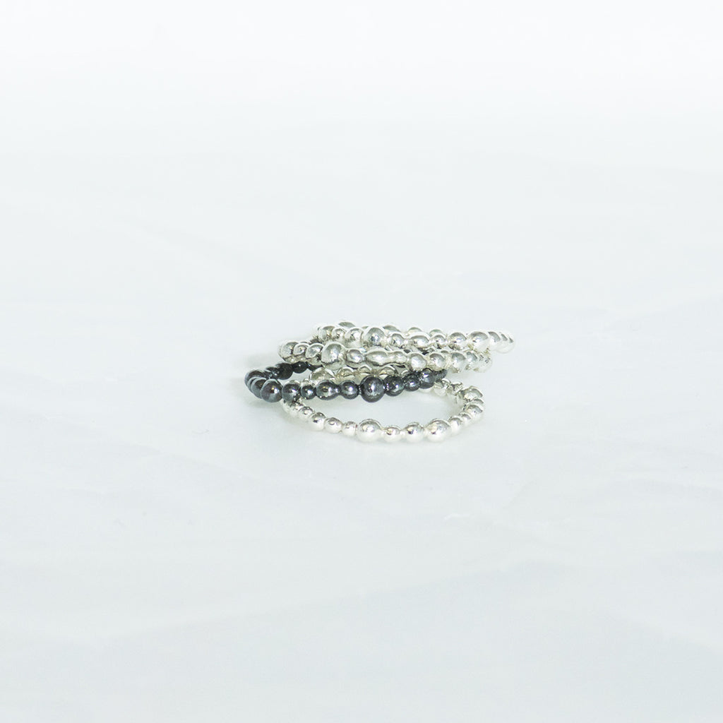 A delicate ring consisting of irregular spheres made in 925/000 silver blackened.