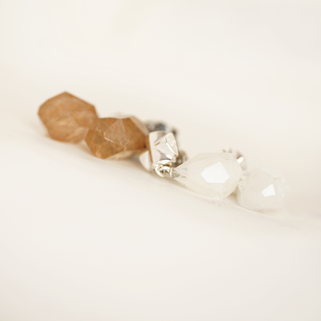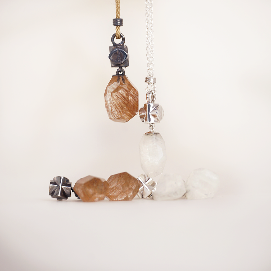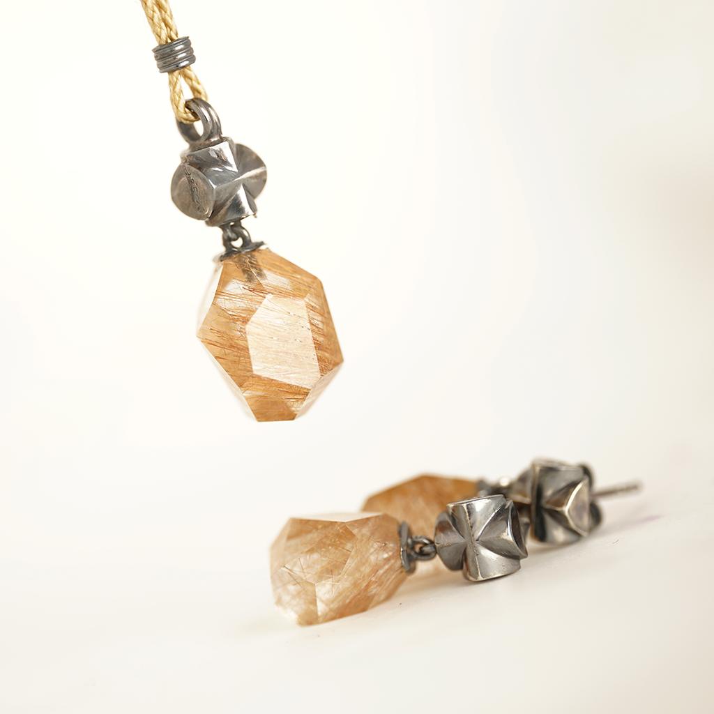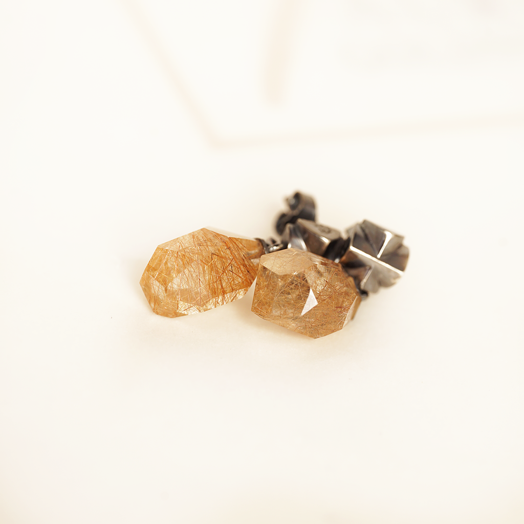 An unusual pair of earrings made from 925/000 silver. The two rutile quartz crystals and the fine shapes in blackened silver are the main features of this ear jewelry.