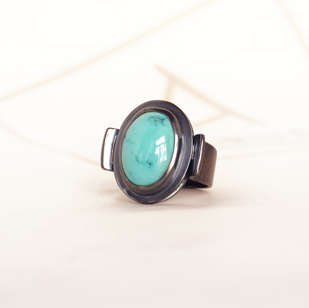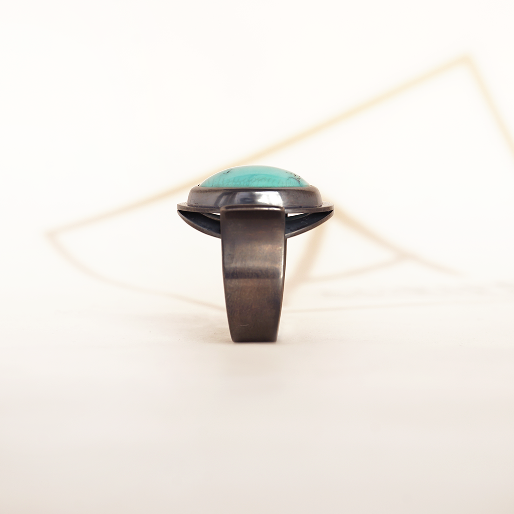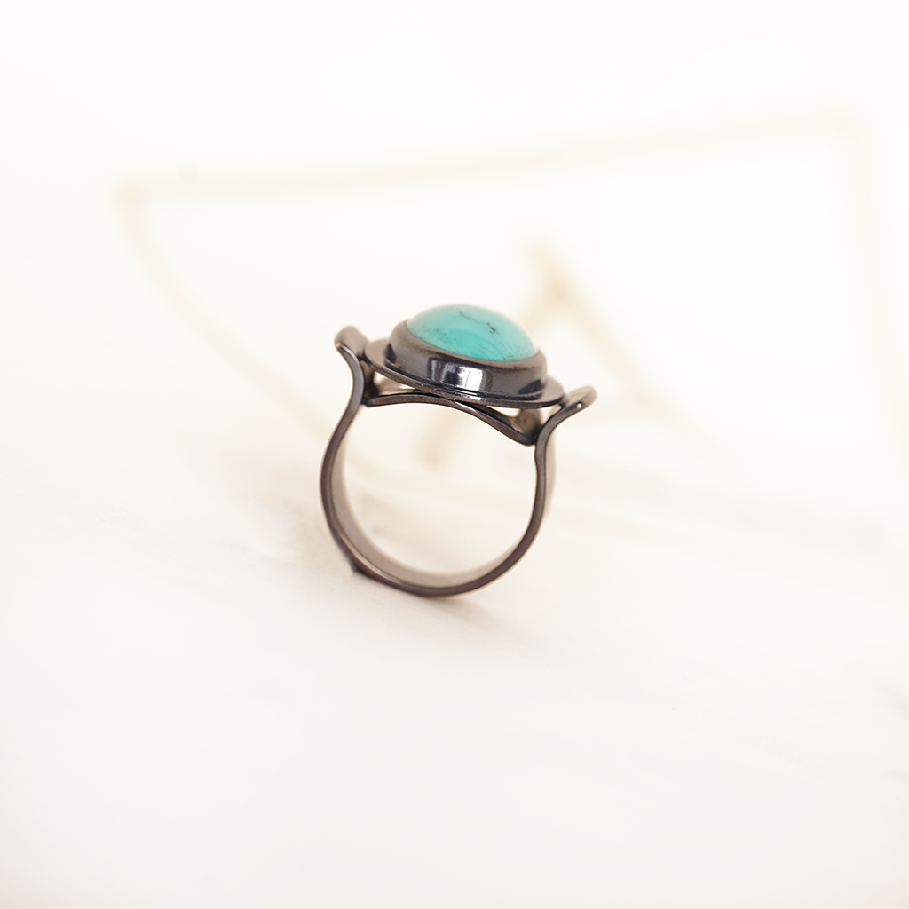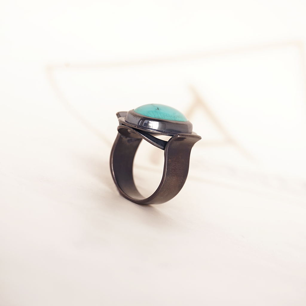 An unusual ring made from blackened 925/000 silver. The main feature of this ring is the turquoise from Persia./p>