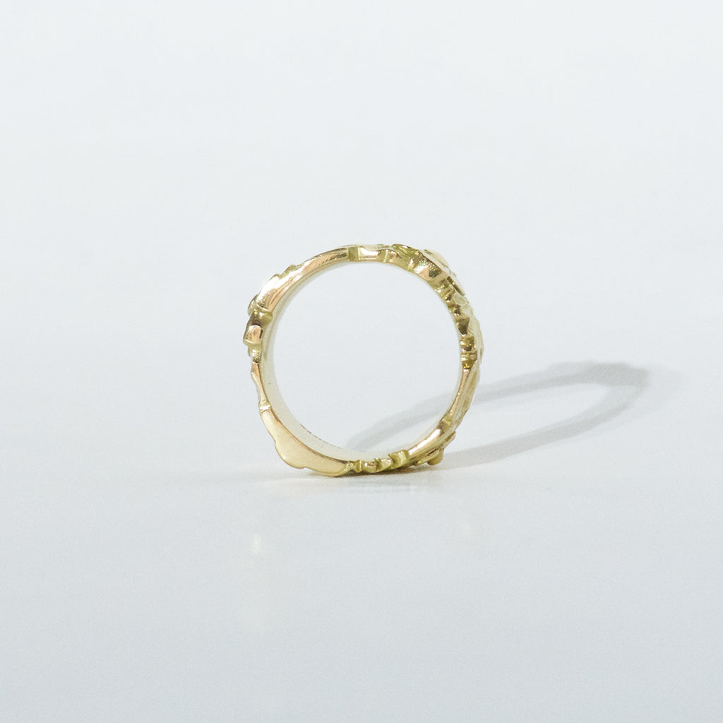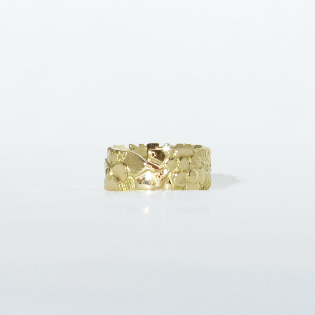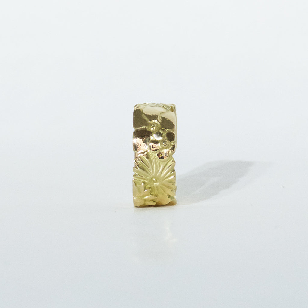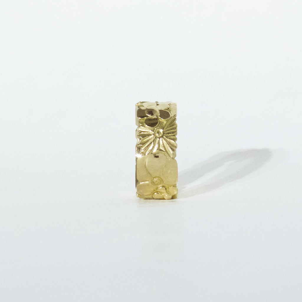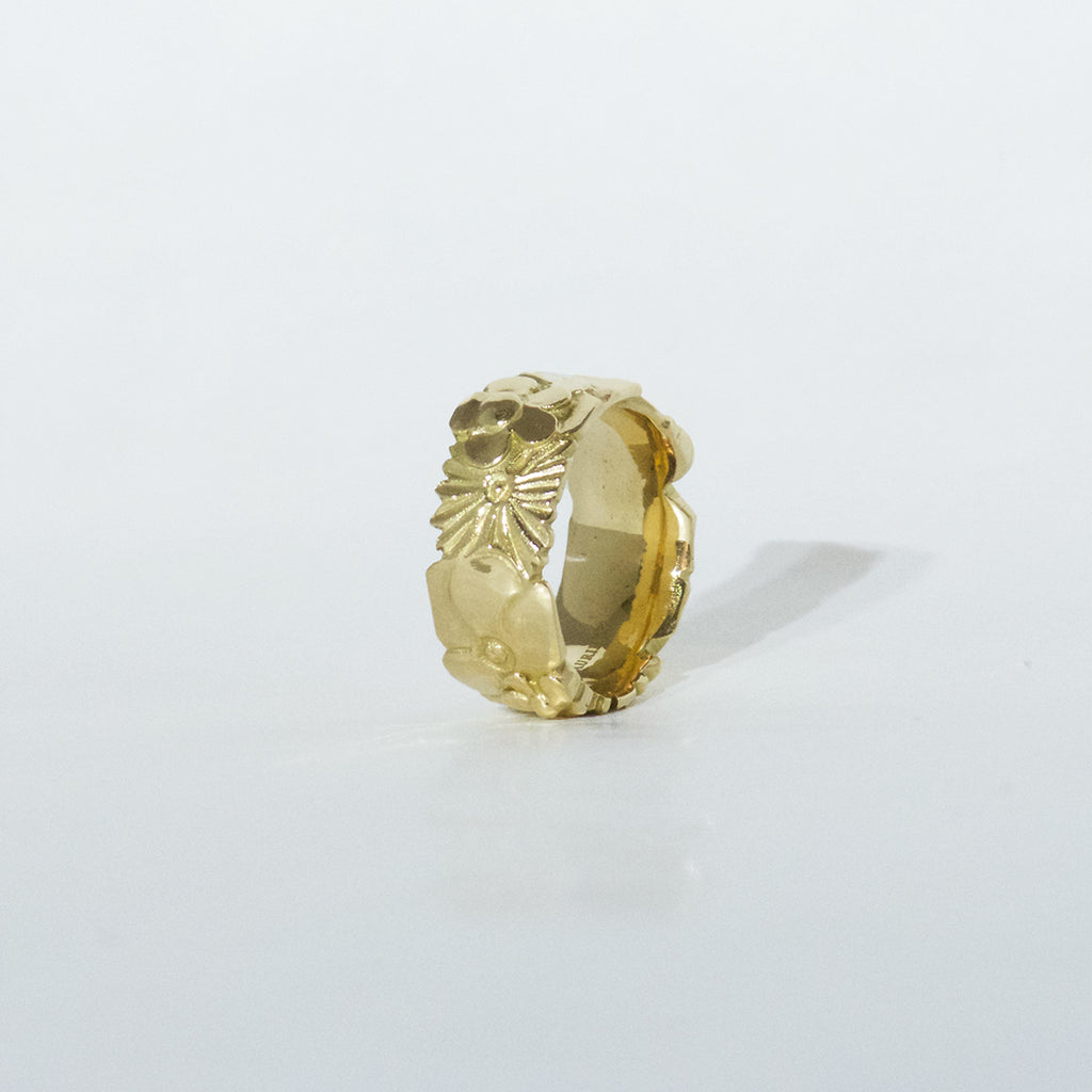 A broad, polished ring from our blossom collection made of 750/000 yellow gold. A variation of different blossoms rises from the surface in relief. The ring is 10mm wide