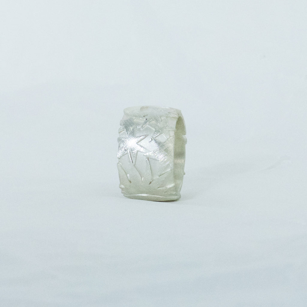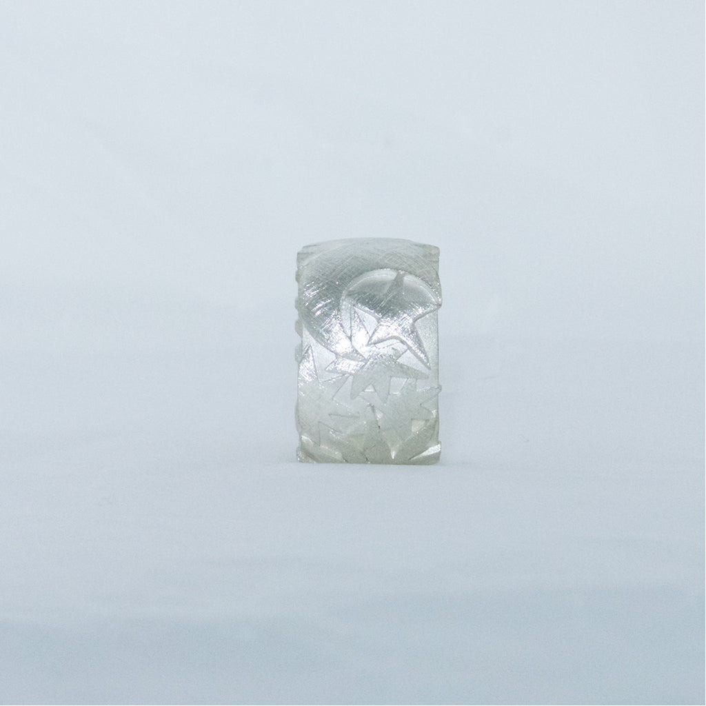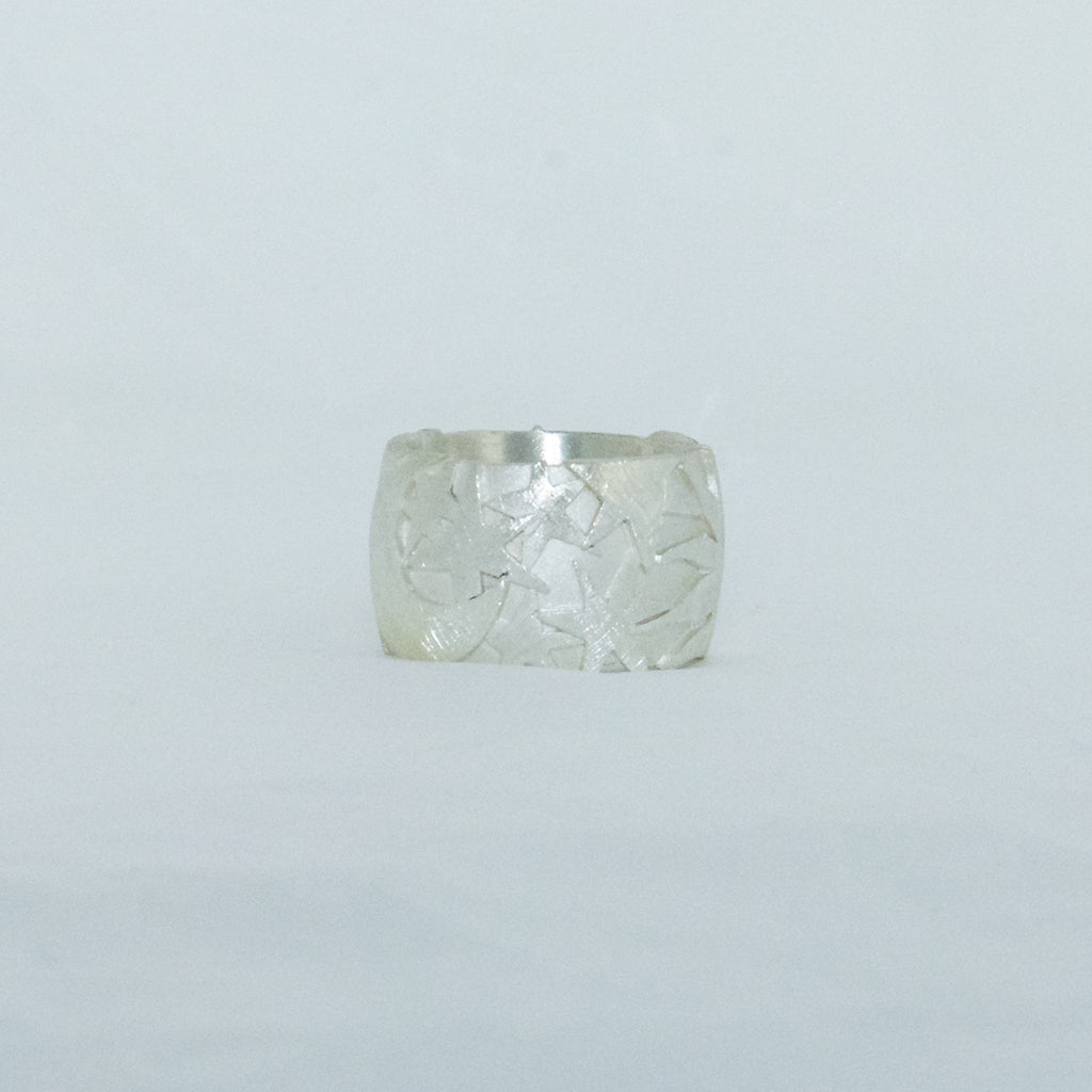 A broad ring from our SonneMondSterne collection made of 925/000 silver with a matt finish. On the surface of the ring is made a relief of sun, moon and stars. The ring is 15mm wide.