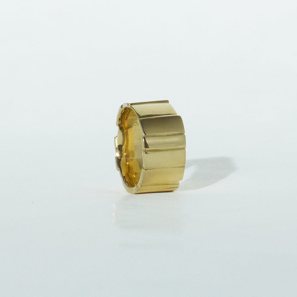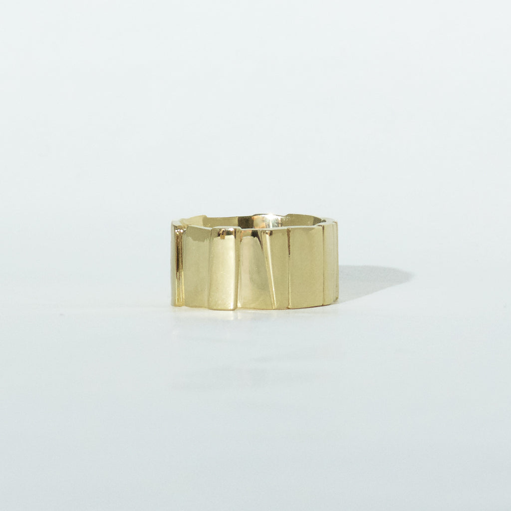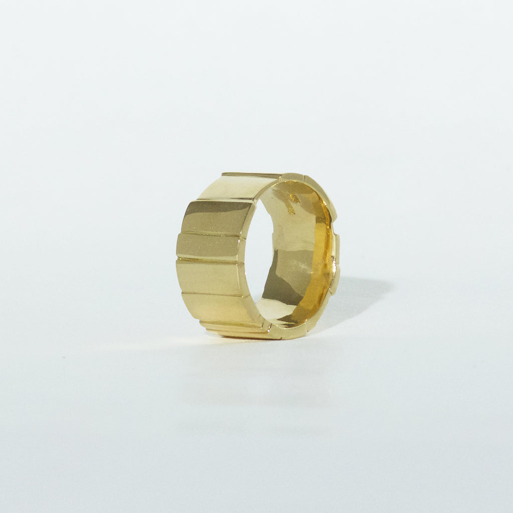 A broad, polished ring from the Flächen collection made of 750/000 yellow gold. The areas are uneven in shape and position, creating a varied look. The ring is 11mm wide
