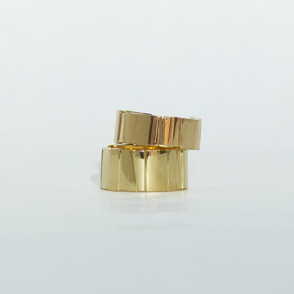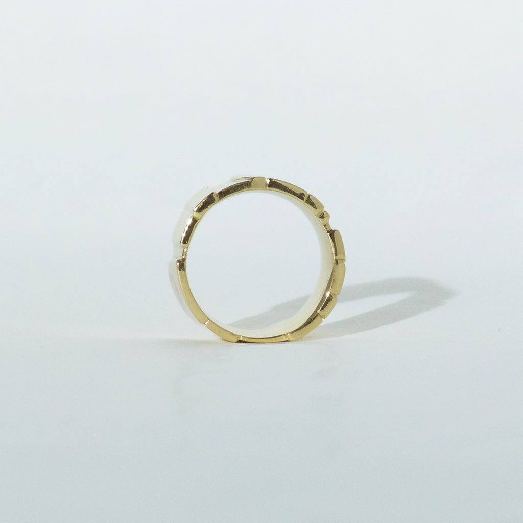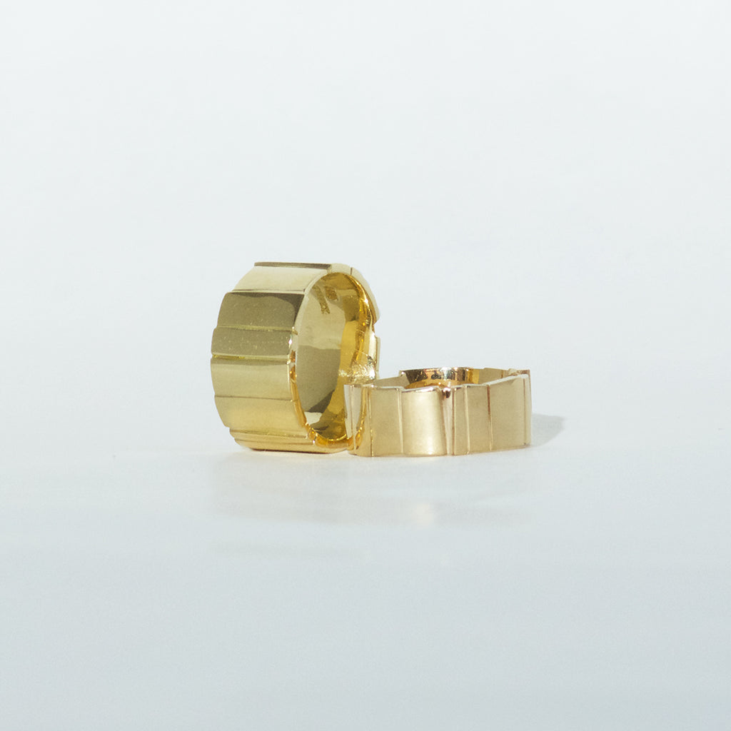 A broad, polished ring from the Flächen collection made of 750/000 yellow gold. The areas are uneven in shape and position, creating a varied look. The ring is 11mm wide