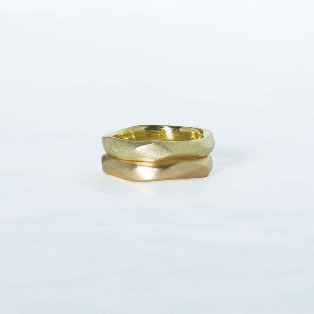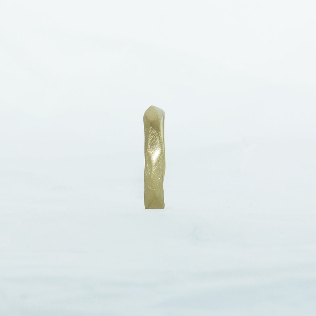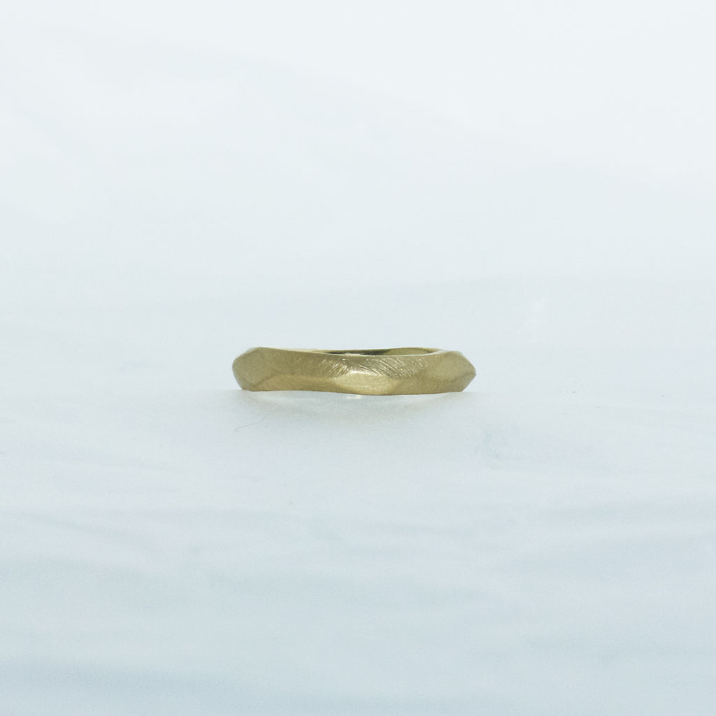 This faceted, narrow ring is in 750/000 yellow gold and has a matt finish. The applied surfaces create exciting lines and facets. The ring looks different from each side. The ring is 4.0-5.0mm wide.