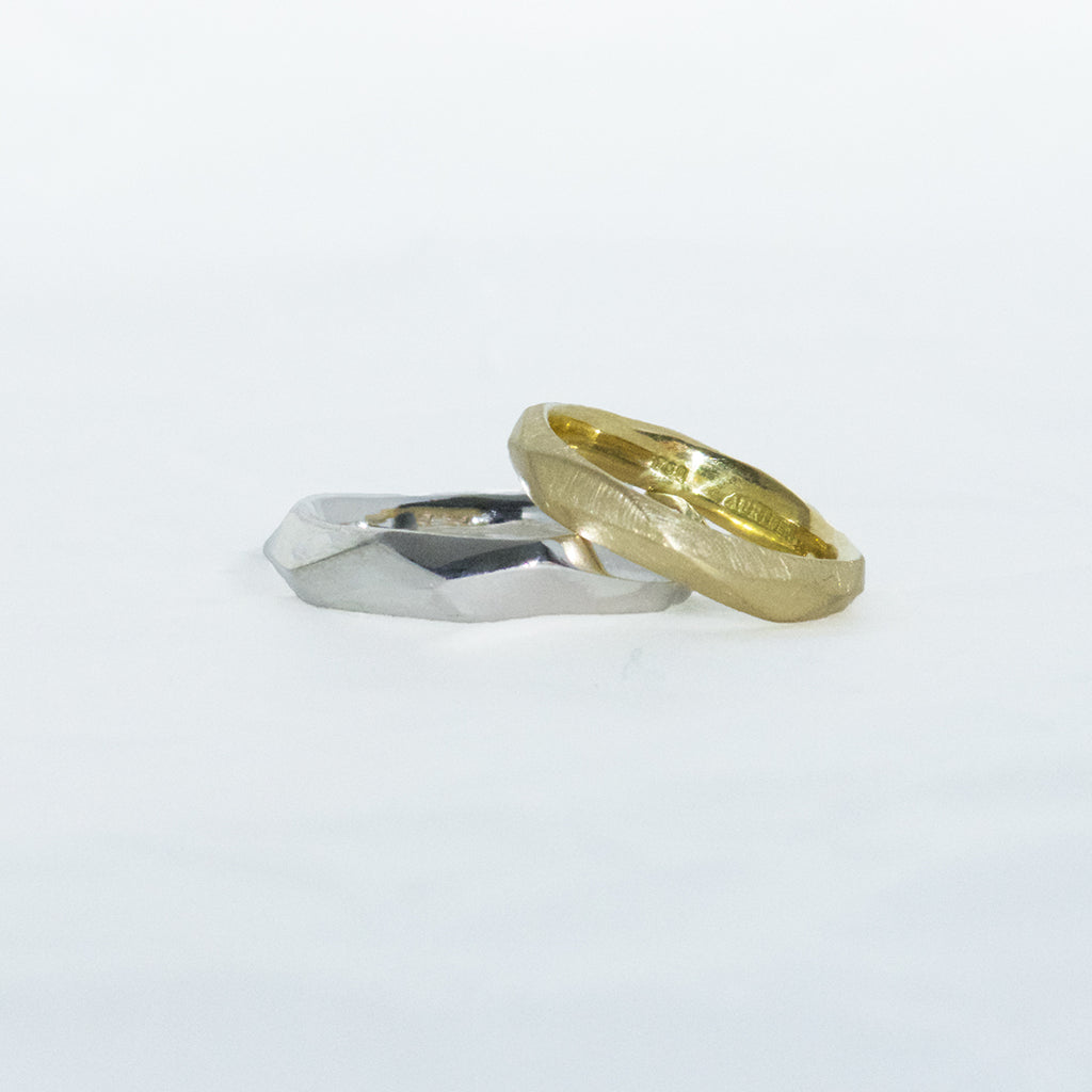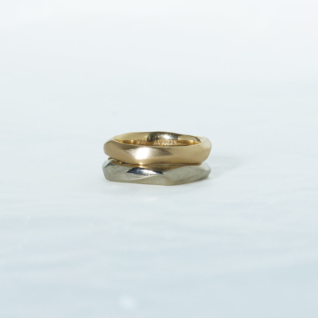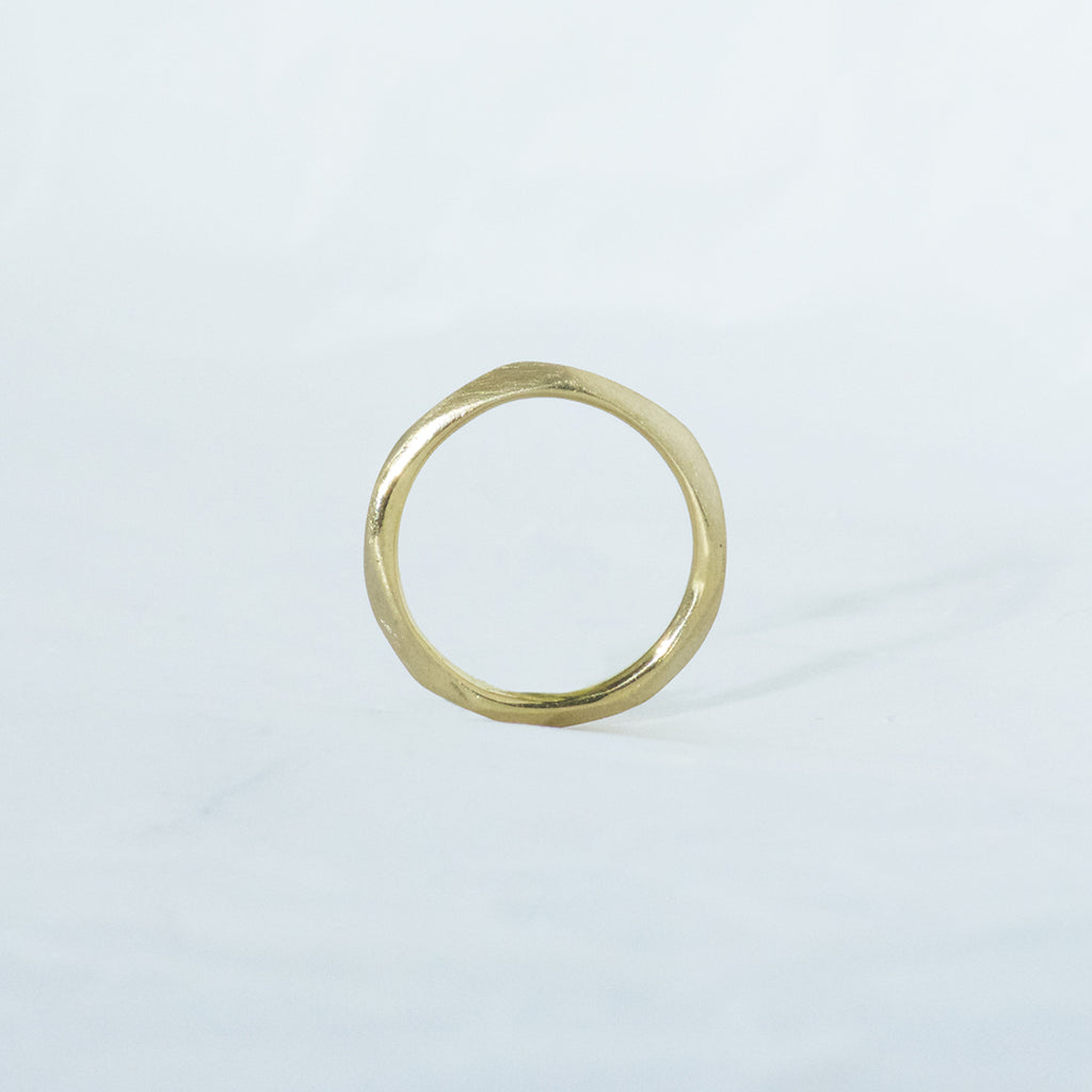 This faceted, narrow ring is in 750/000 yellow gold and has a matt finish. The applied surfaces create exciting lines and facets. The ring looks different from each side. The ring is 4.0-5.0mm wide.