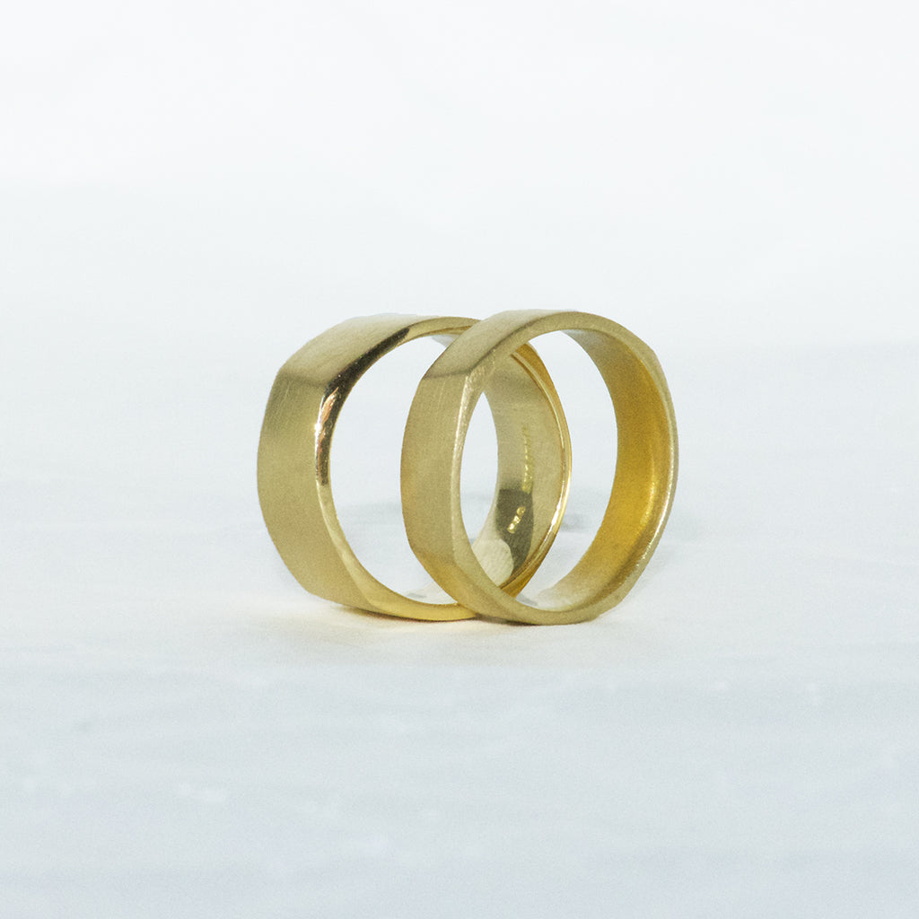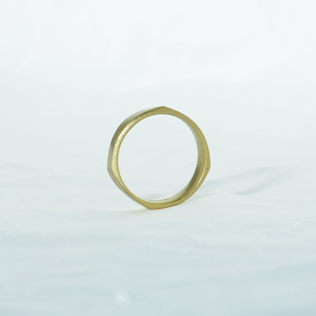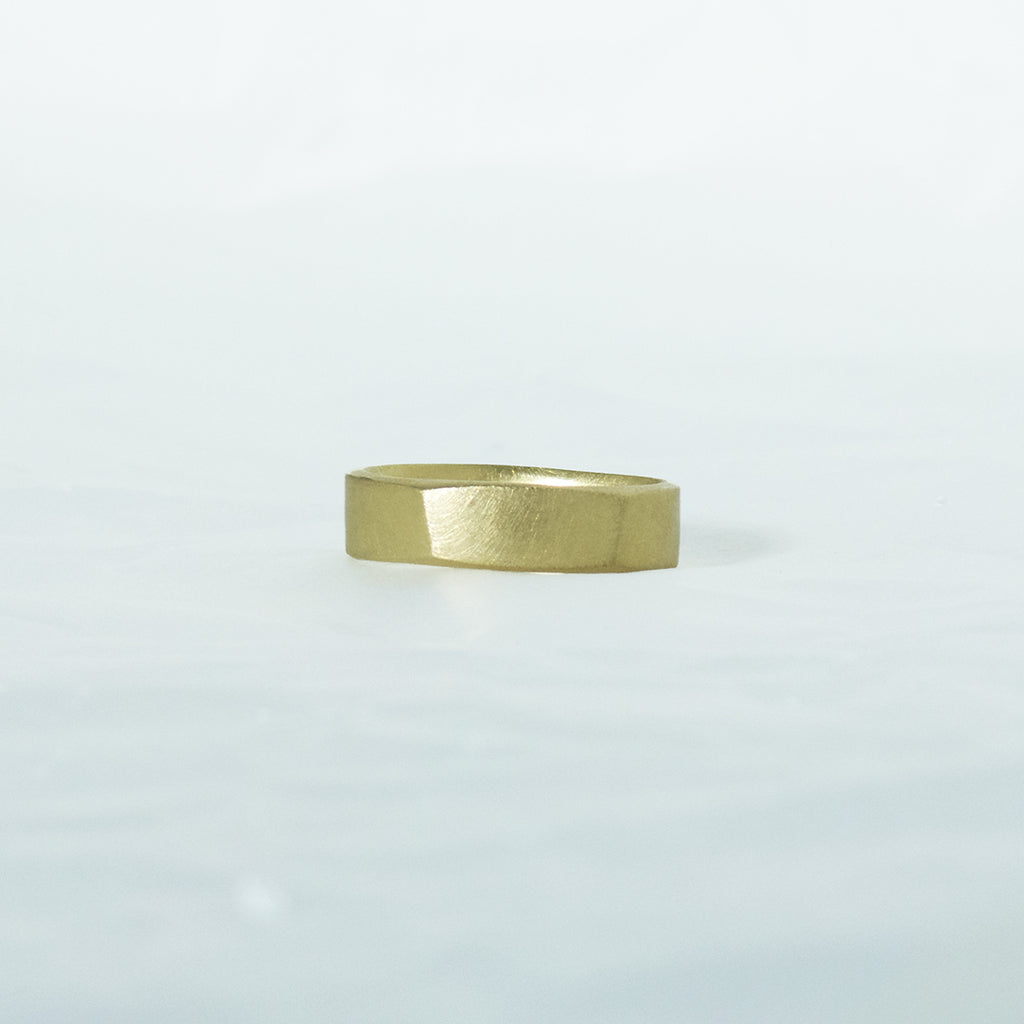 This unusual, narrow ring called a square is made in 750/000 yellow gold. The outer shape of the ring has been altered to create a square shape. This creates exciting lines and facets on the surface and from each side the ring looks different. The ring is 5mm wide.