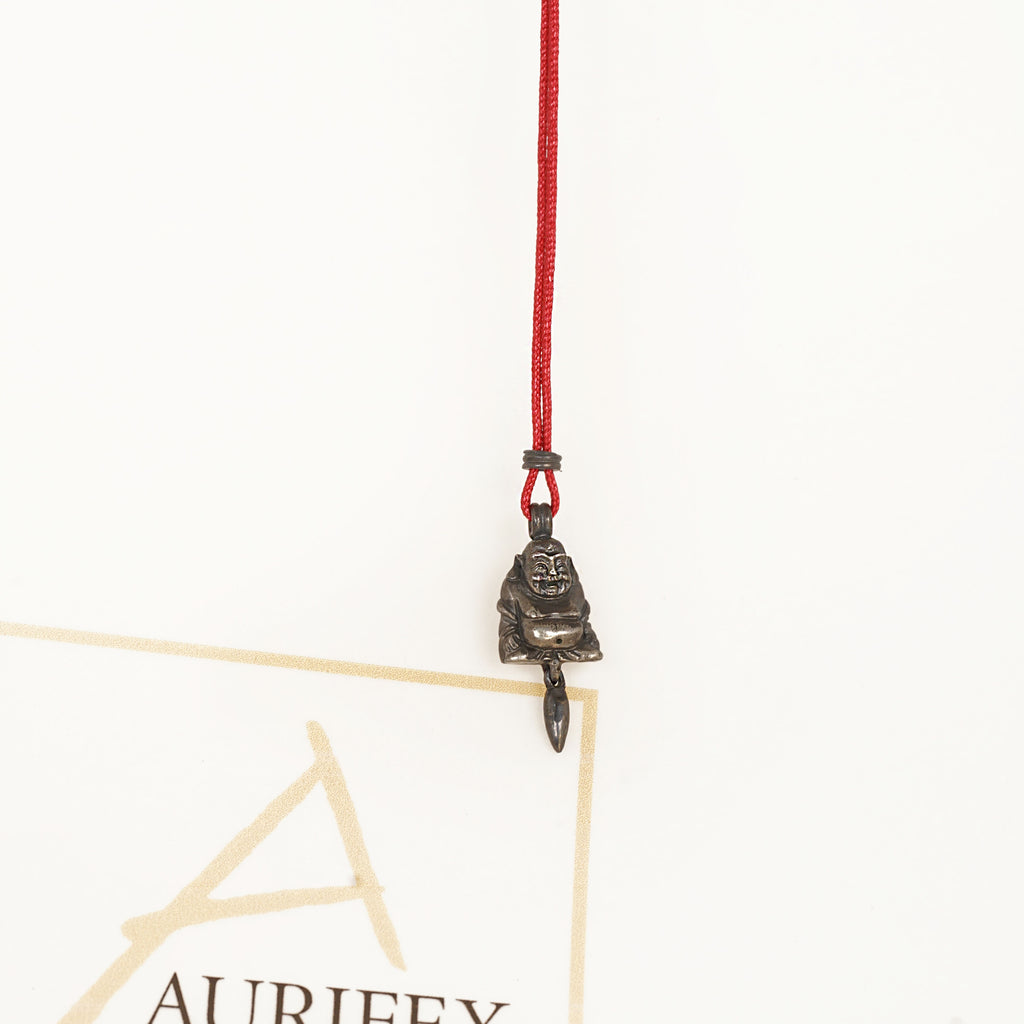 A delicate necklace made from blackened 925/000 silver with paracord. The main feature of this necklace is the Buddha with a polished surface, which is complemented by a tassel.