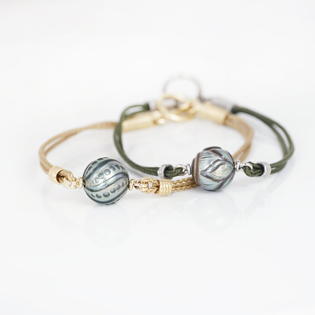 A special bracelet from our Perlenkultur collection in 750/000 yellow gold with a polished surface. The bracelet is set with an engraved pearl in an intense blue/green. The bracelet can be closed with a toggle clasp in 750/000 yellow gold./p>