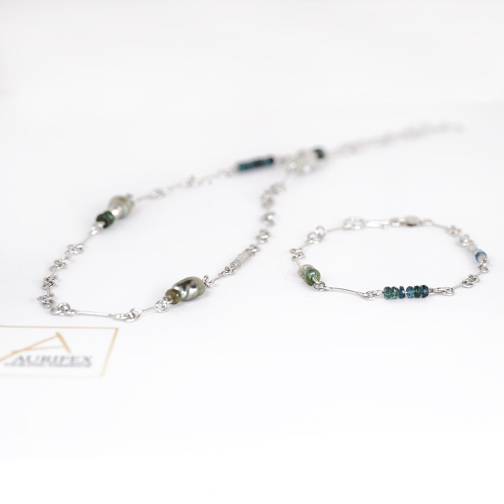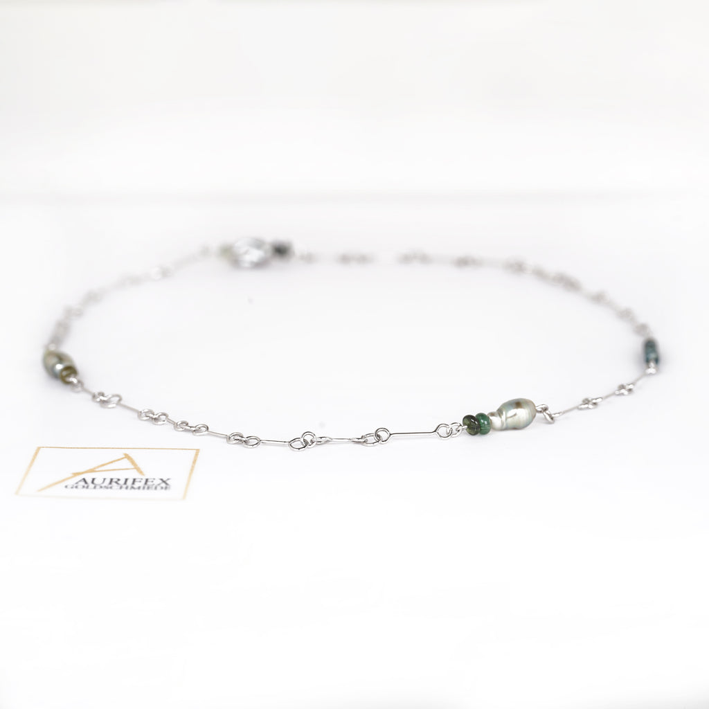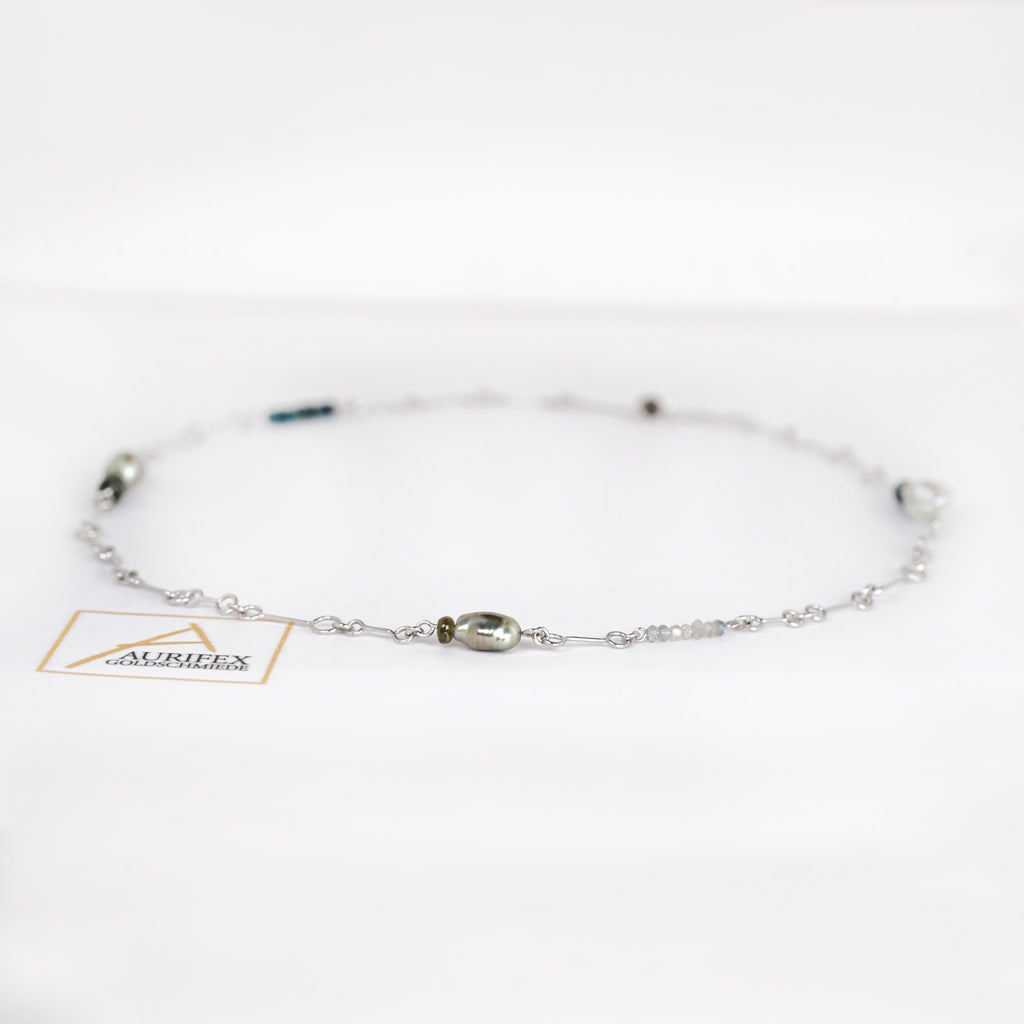 Armband aus der Kollektion Unikat in Platin mit Keshi Perlen, Labradorit und Turmalin