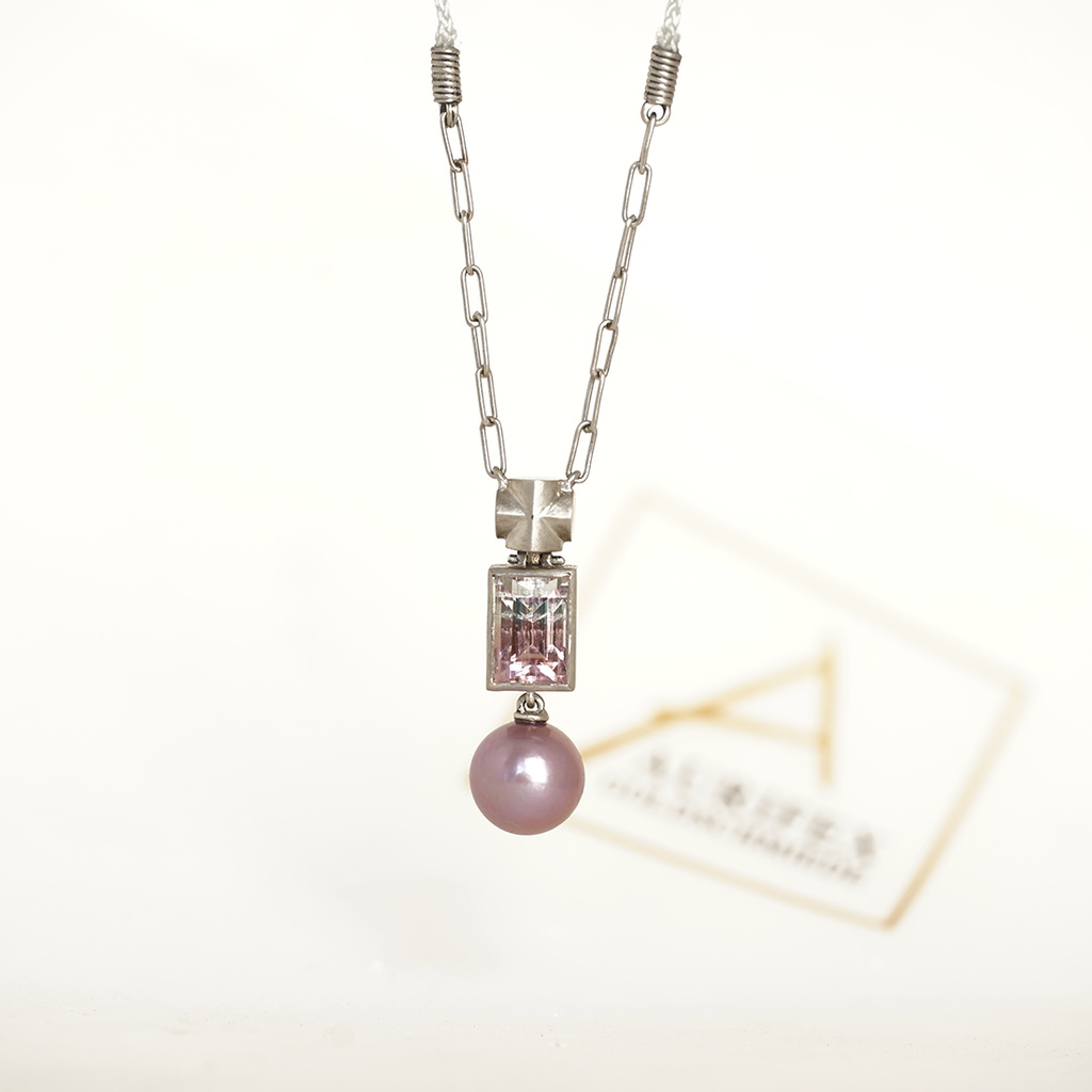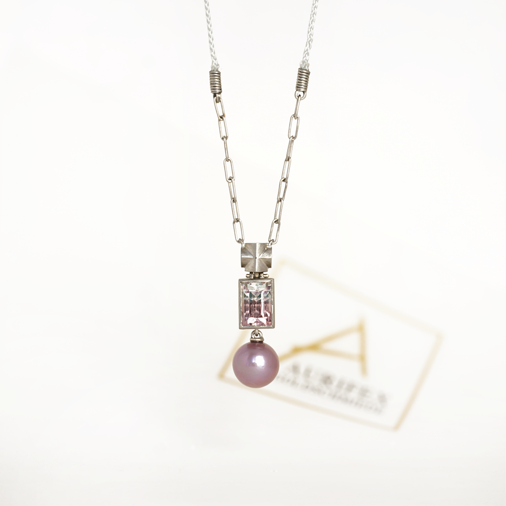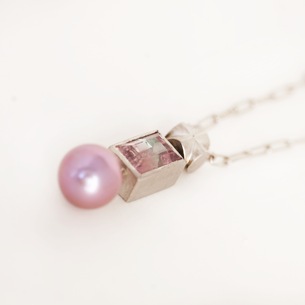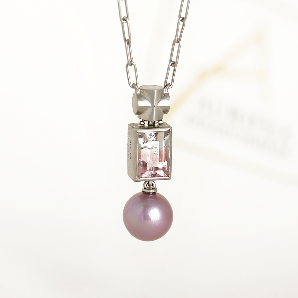 An unusual necklace from the Unikat collection in 950/000 platinum with a matt finish. The main feature of this necklace is the tourmaline with a 4.96ct color gradient and the freshwater cultured pearl in rosé. The pendant is complemented by a cross made from 950/000 platinum. The pendant is attached to a piece of narrow eyelet chain made from 950/000 platinum and paracord.