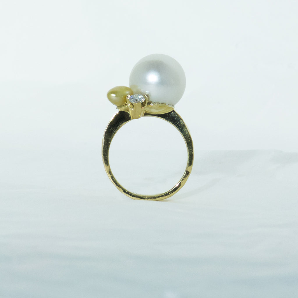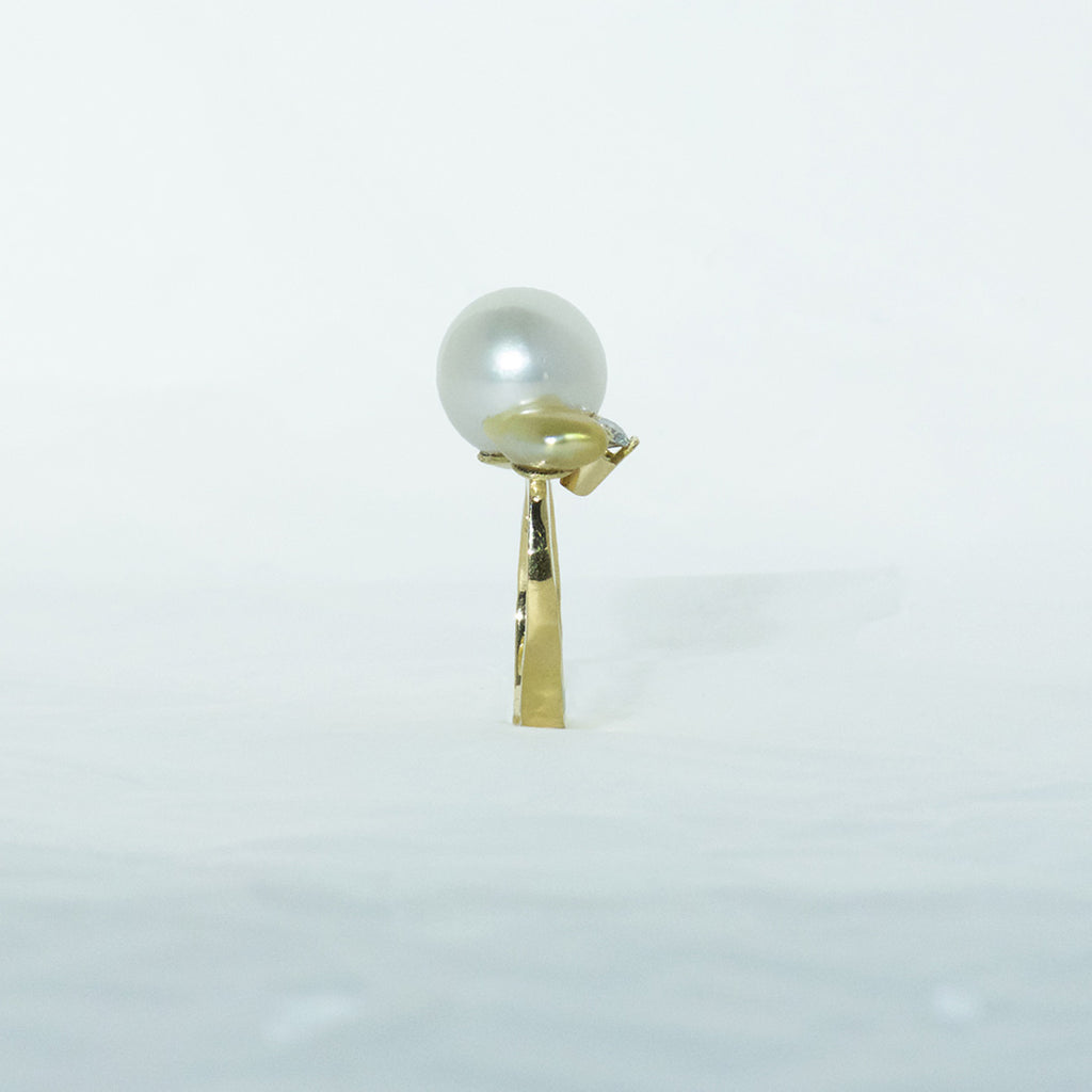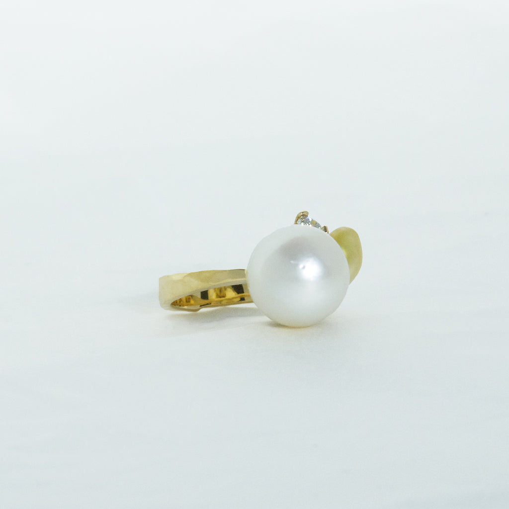 An eye-catching ring with a delicate hammered rail in 750/000 yellow gold. The two pearls and the 0.20ct brilliant-cut diamond have been carefully selected and given room to shine through the polished gold surface. This ring holds a South Sea pearl with a diameter of approx. 13mm, a golden keship pearl and a brilliant-cut diamond weighing 0.20ct. We present a matching ear jewellery.