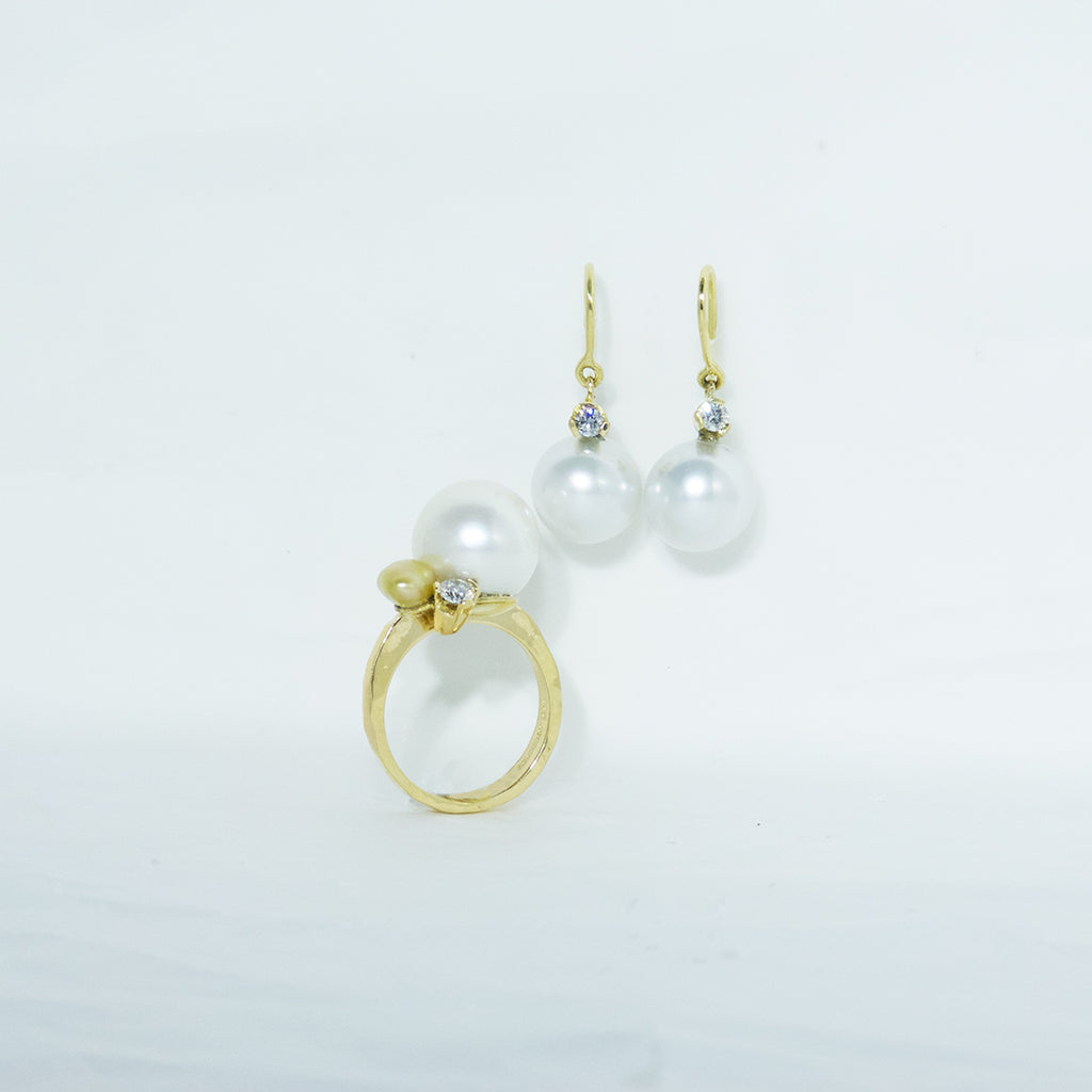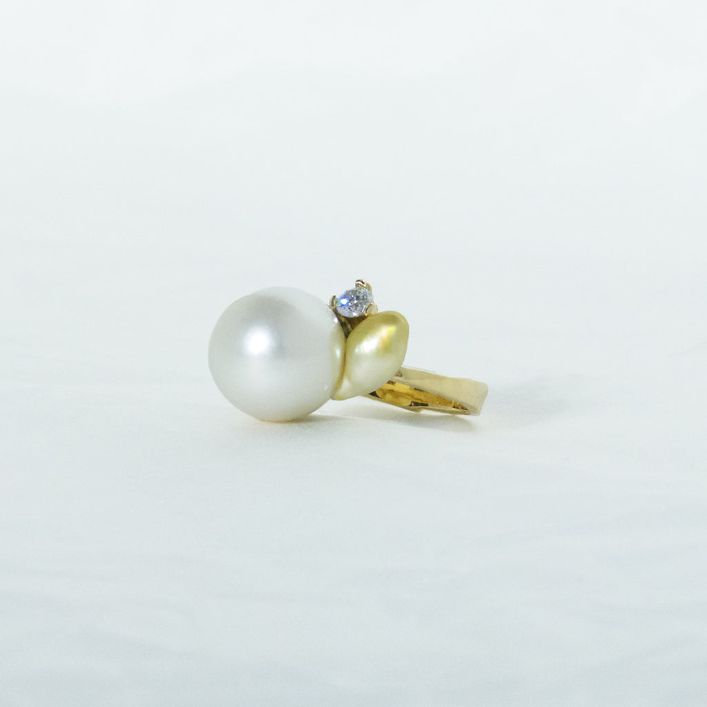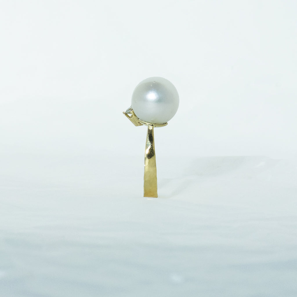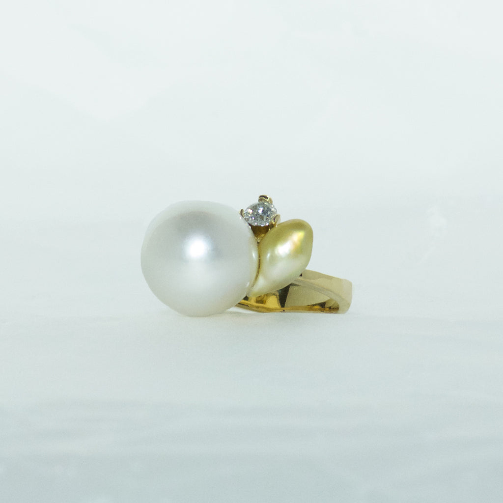 An eye-catching ring with a delicate hammered rail in 750/000 yellow gold. The two pearls and the 0.20ct brilliant-cut diamond have been carefully selected and given room to shine through the polished gold surface. This ring holds a South Sea pearl with a diameter of approx. 13mm, a golden keship pearl and a brilliant-cut diamond weighing 0.20ct. We present a matching ear jewellery.