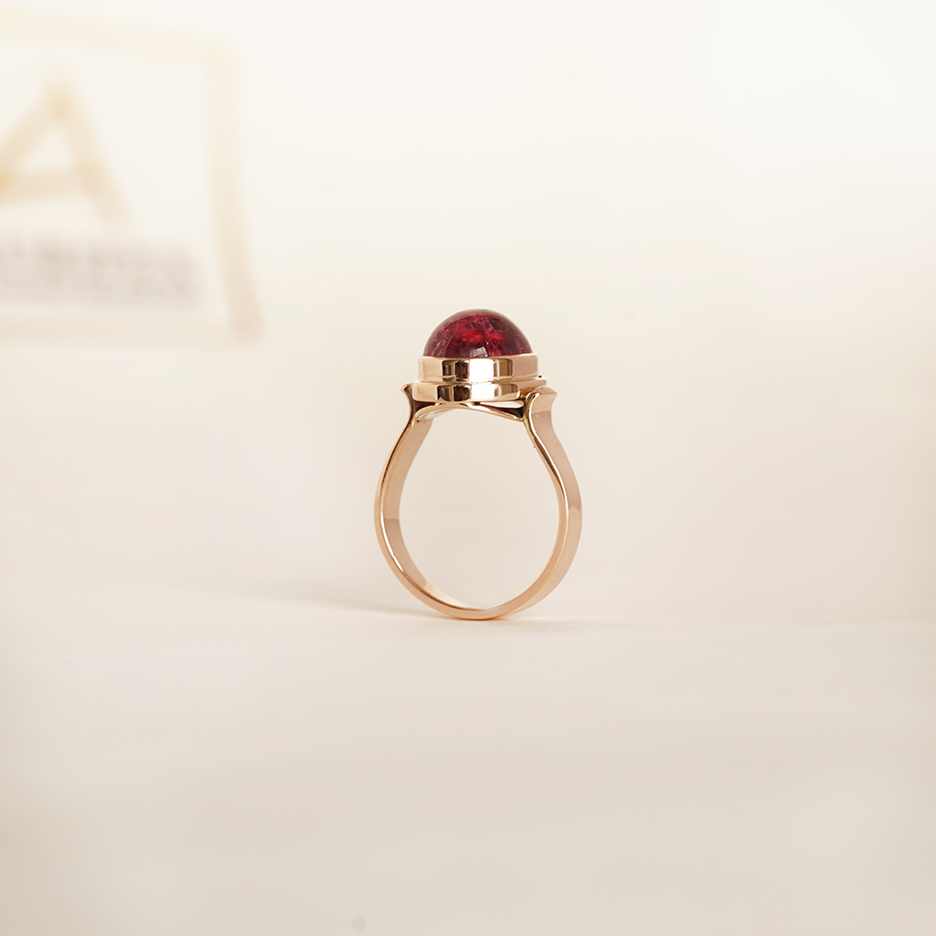 A special ring made from 750/000 rose gold. The main feature of this ring is the 8.46ct cabouchon-cut tourmaline. Thanks to the unusual setting, the colored stone also receives light from the underside, so that the color is shown to its best advantage.