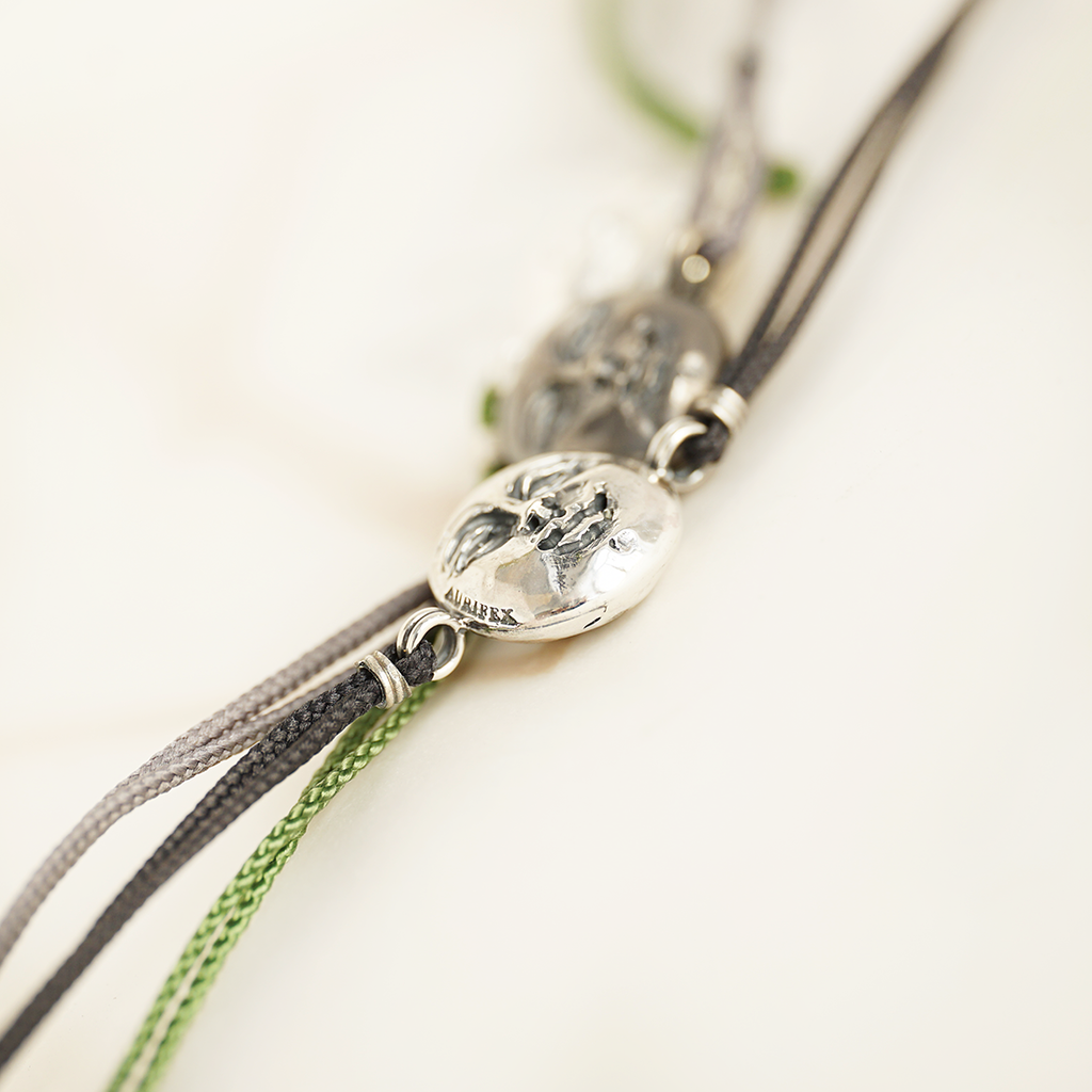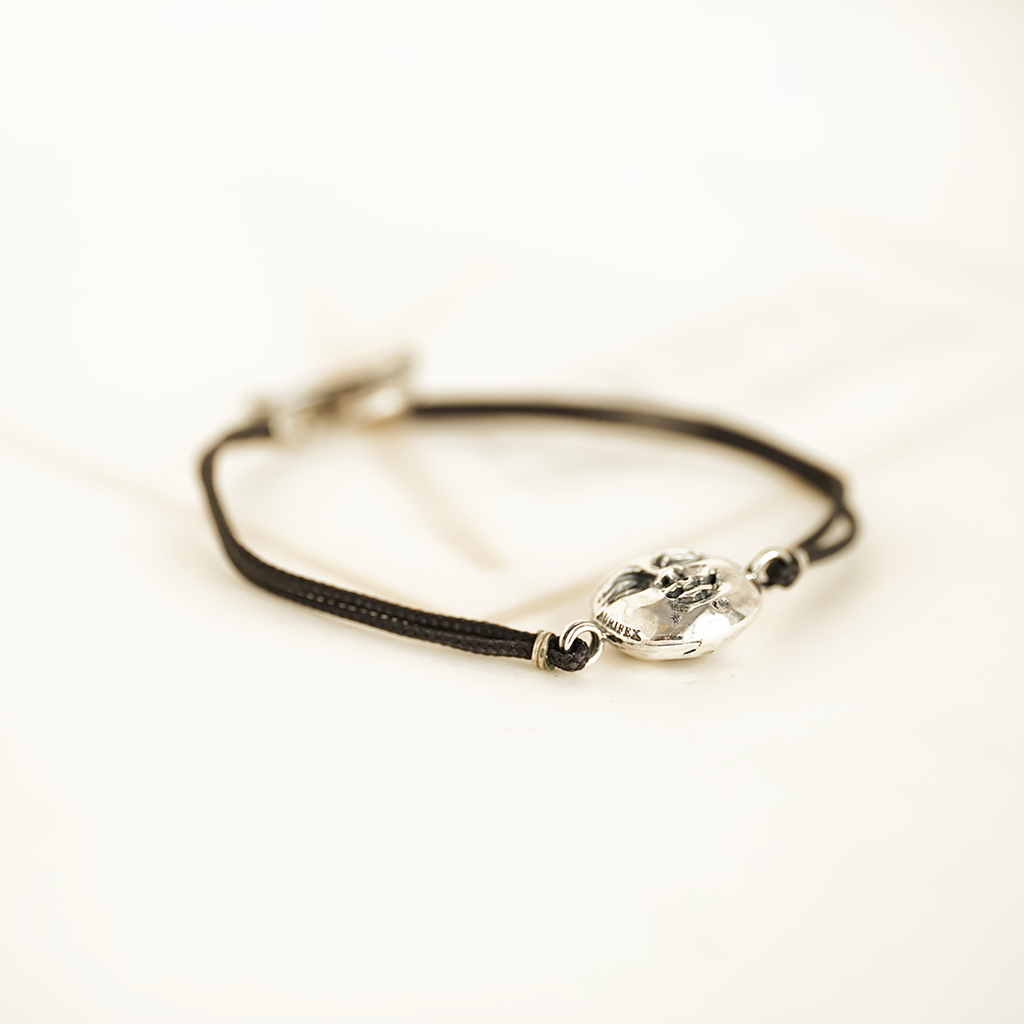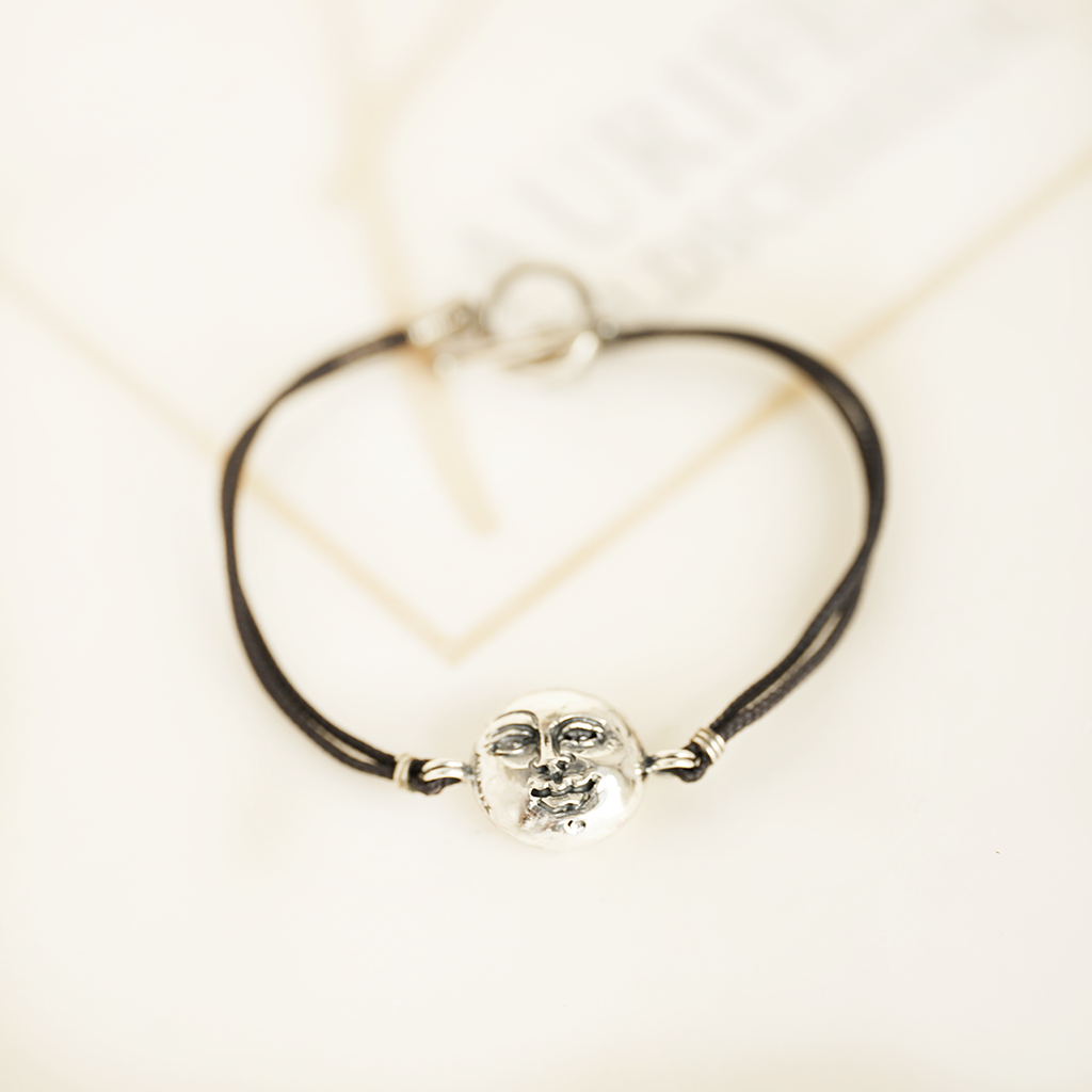 A delicate bracelet made from 925/000 silver with paracord. The main feature of this bracelet is the moon face with a polished surface. The bracelet is fastened with a toggle clasp made from 925/000 silver.