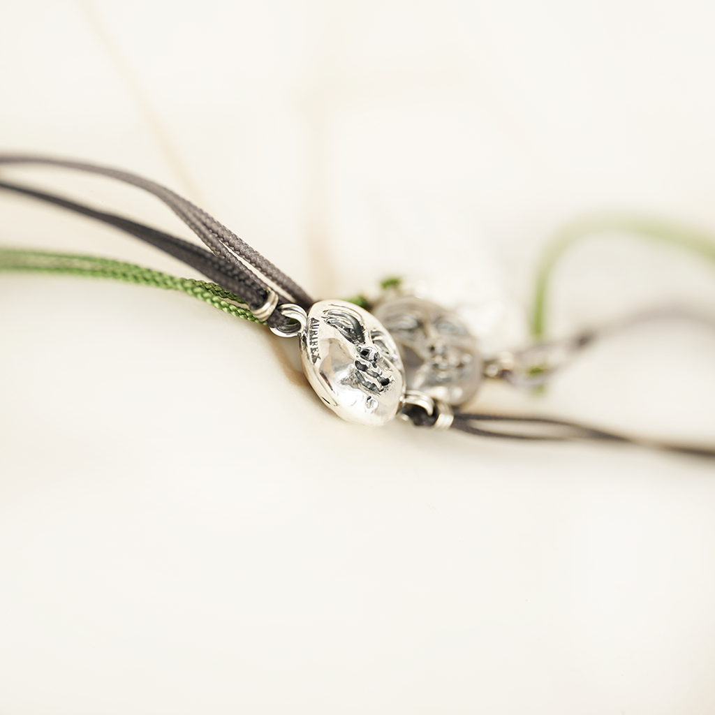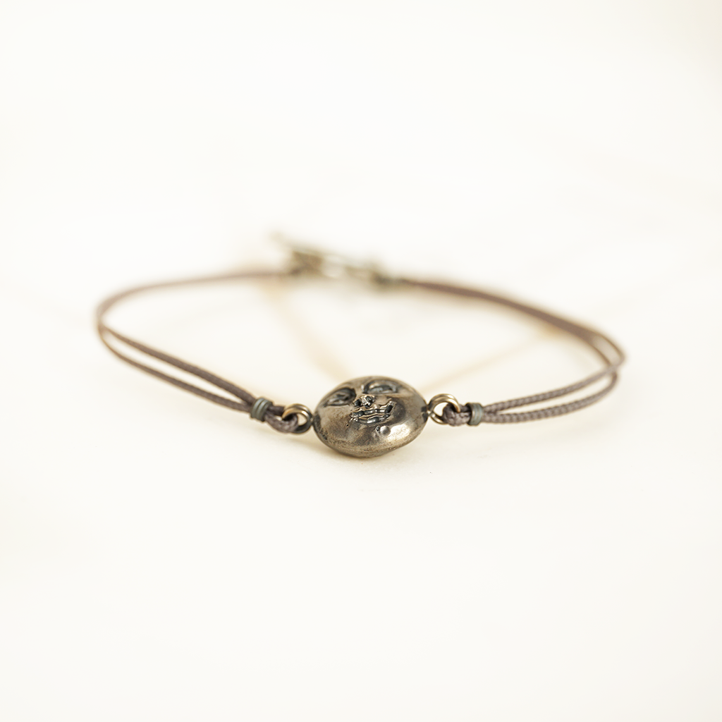 A delicate bracelet made from 925/000 silver blackened with paracord. The main feature of this bracelet is the moon face with a polished surface. The bracelet is fastened with a toggle clasp made from 925/000 blackened silver.
