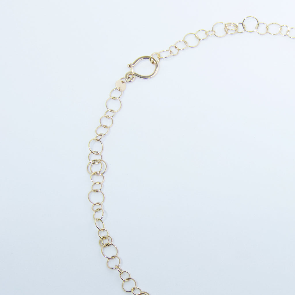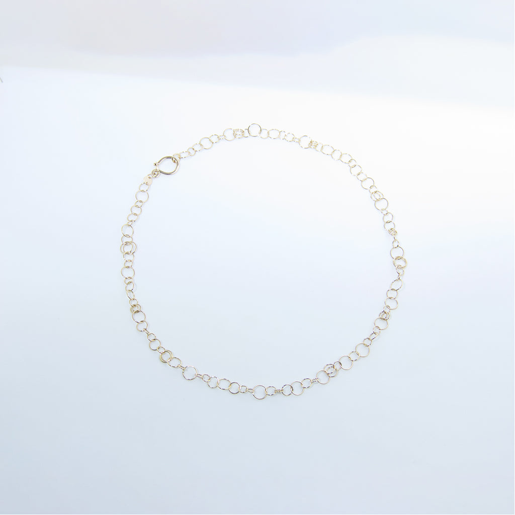 Ein zarter Halsschmuck aus der Kollektion Feine Form gefertigt in 750/000 Rotgold mit einer polierten Oberfläche. Das Modell "Ösenkette-leicht" besteht aus Ösen in verschiedenen Größen und Stärken, die sich weich fließend an den Körper anschmiegen. Als  Verschluss wurde ein rundlicher S-Haken angebracht. Die Kette ist insgesamt 43cm lang.