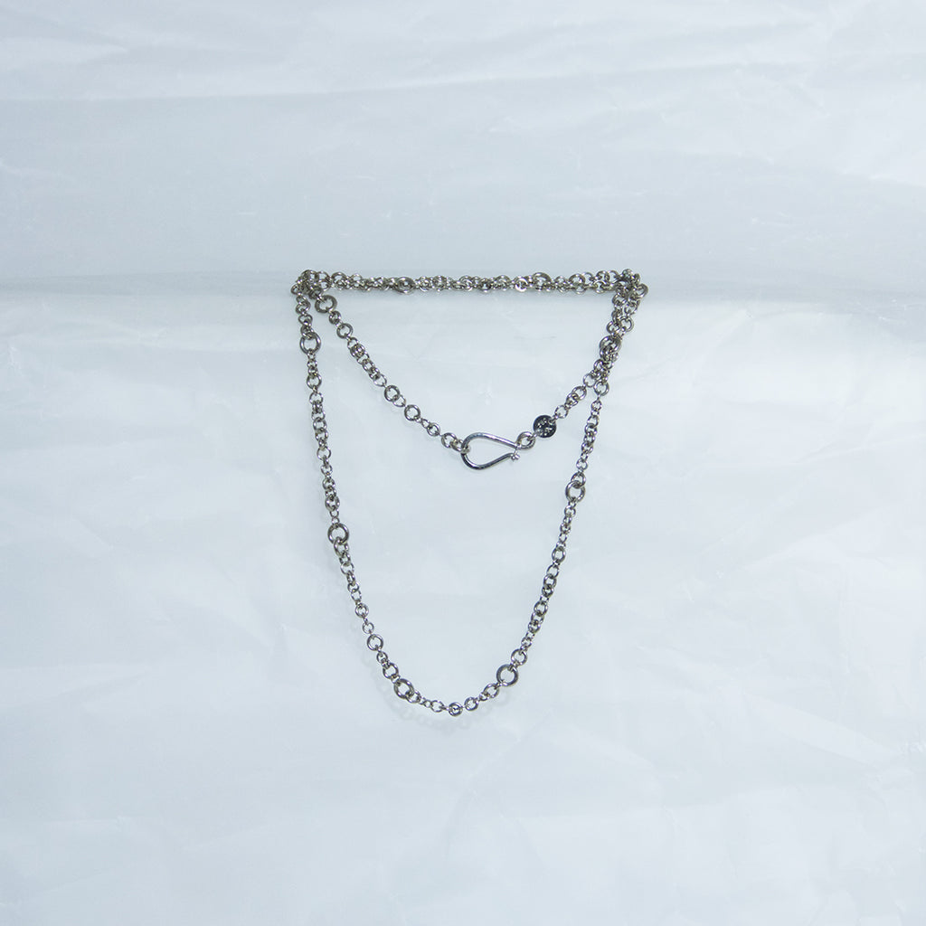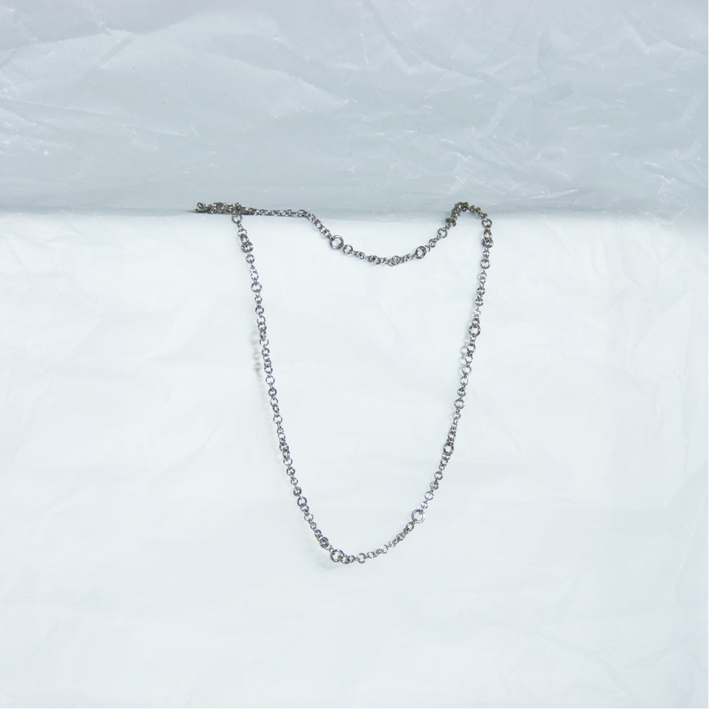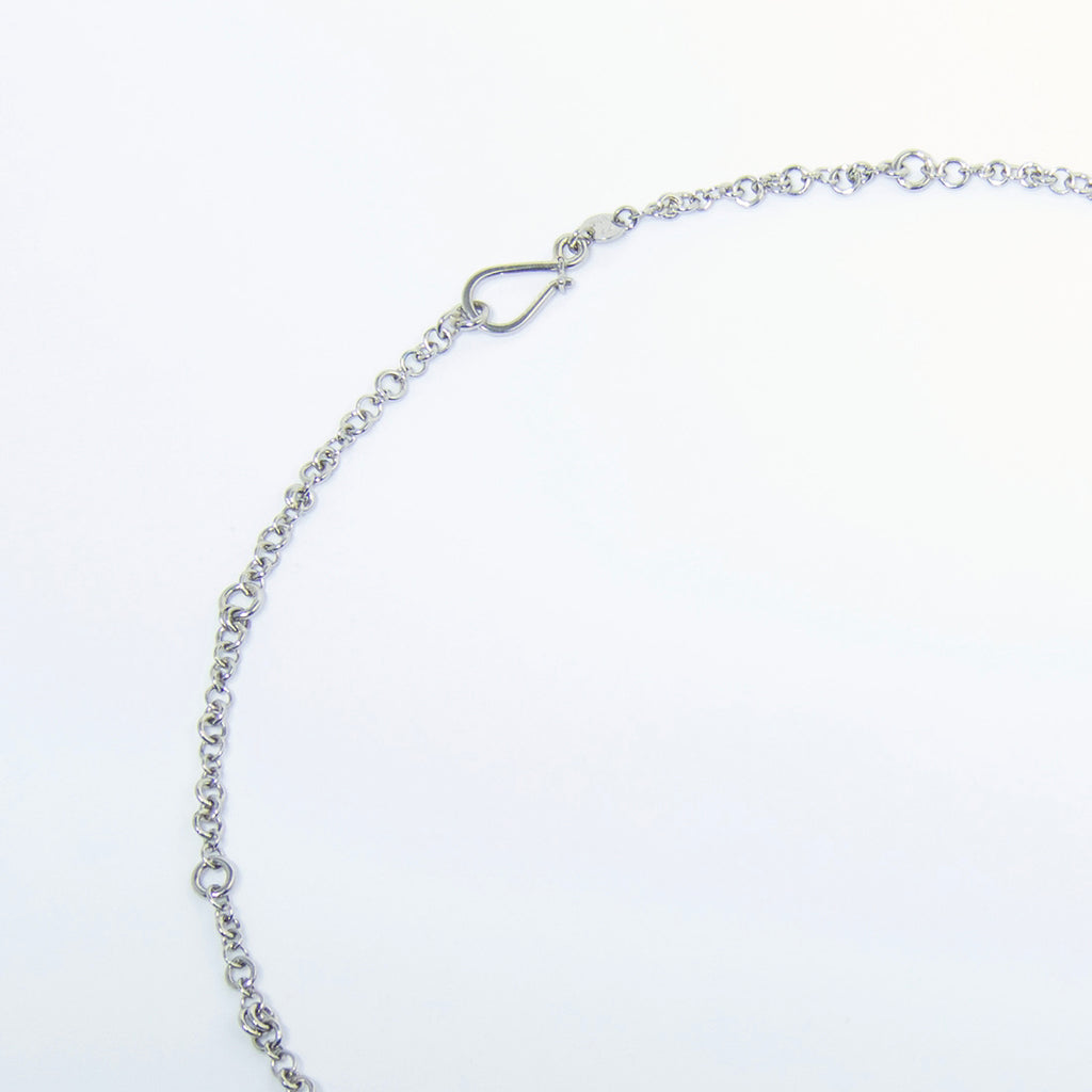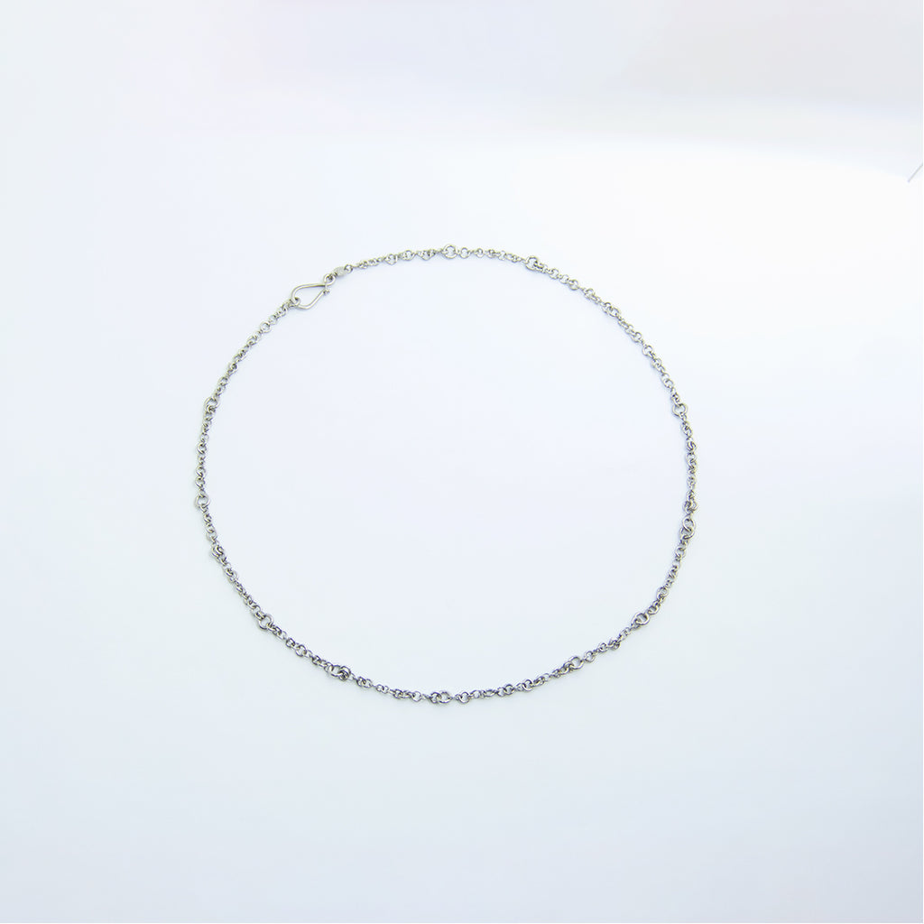 Ein zarter Halsschmuck aus der Kollektion Feine Form gefertigt in 750/000 Weißgold mit einer polierten Oberfläche. Die Ösenkette in der Größe S besteht aus Ösen in verschiedenen Größen und Stärken, die sich weich fließend an den Körper anschmiegen. Als  Verschluss wurde ein zarter S-Haken angebracht. Die Kette ist insgesamt 43cm lang.